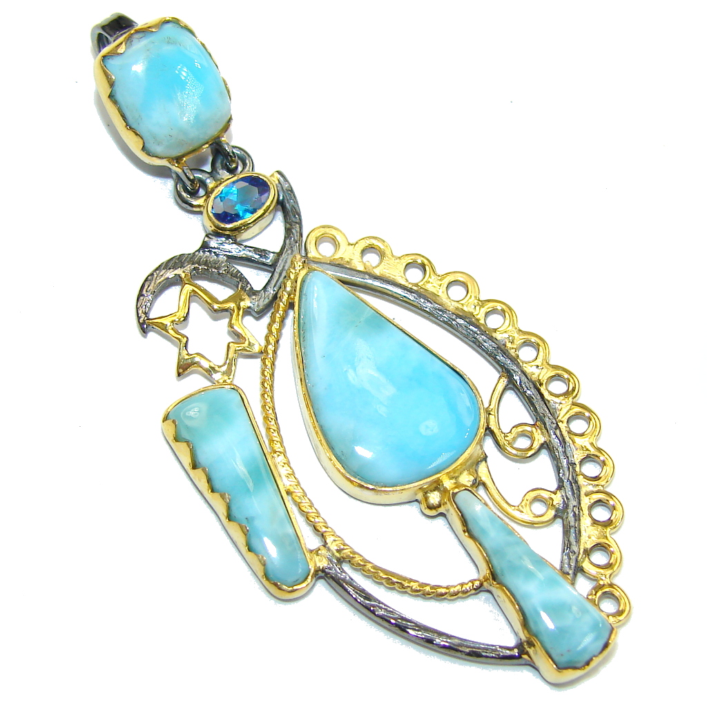 Exotic Style! AAA Blue Larimar & London Blue Topaz, Gold Plated, Rhodium Plated Sterling Silver Pendant