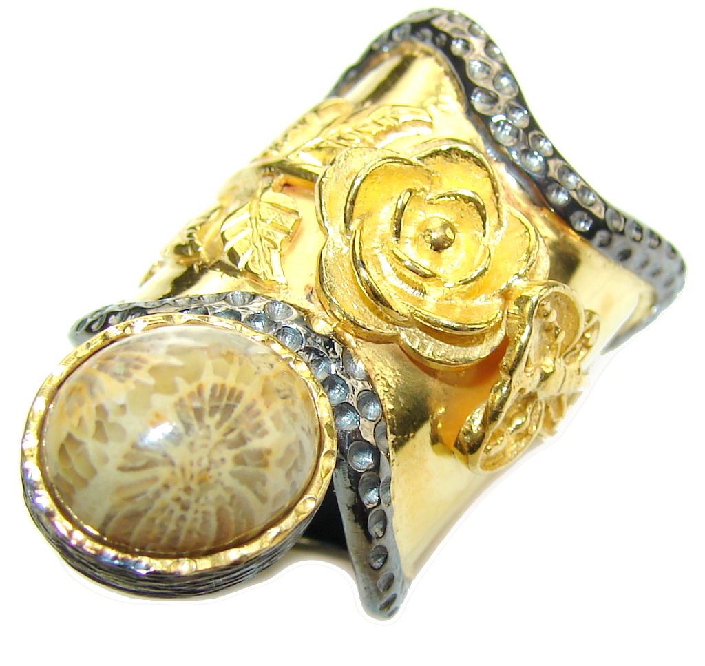 Big! Gorgeous Brown Fossilized Coral, Gold PLated, Rhodium Plated Sterling Silver ring s. 6