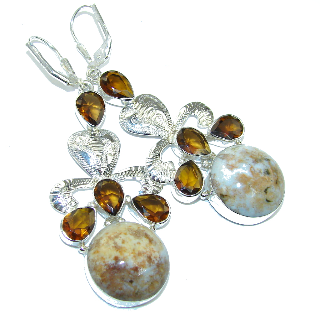 Classic Beauty! Brown Crinoid Fossil & Quartz Sterling Silver earrings