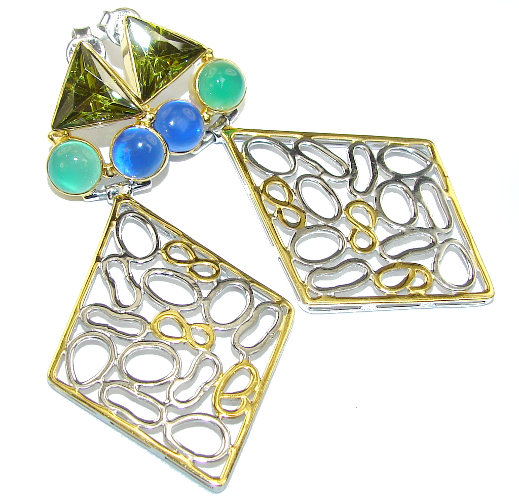 Big! Modern Blue & Green Quartz, Two Tones Sterling Silver Earrings