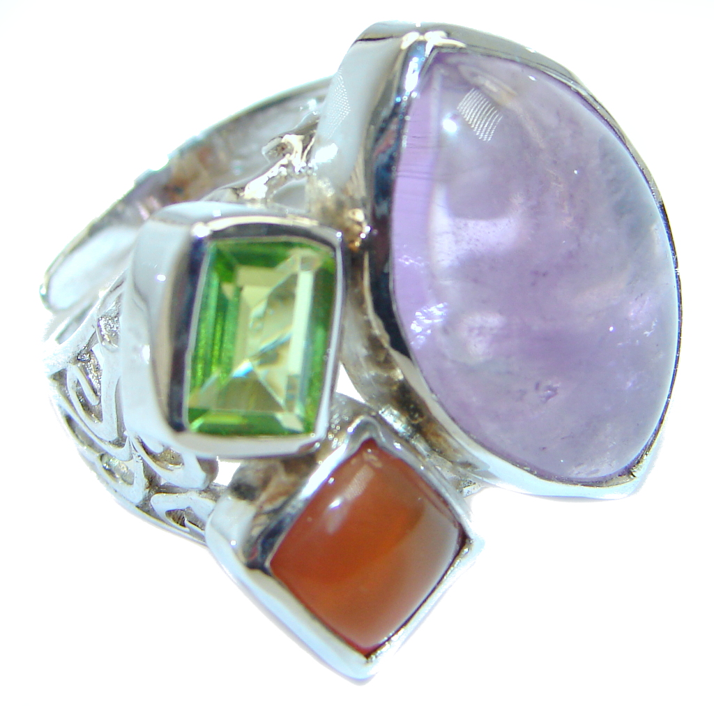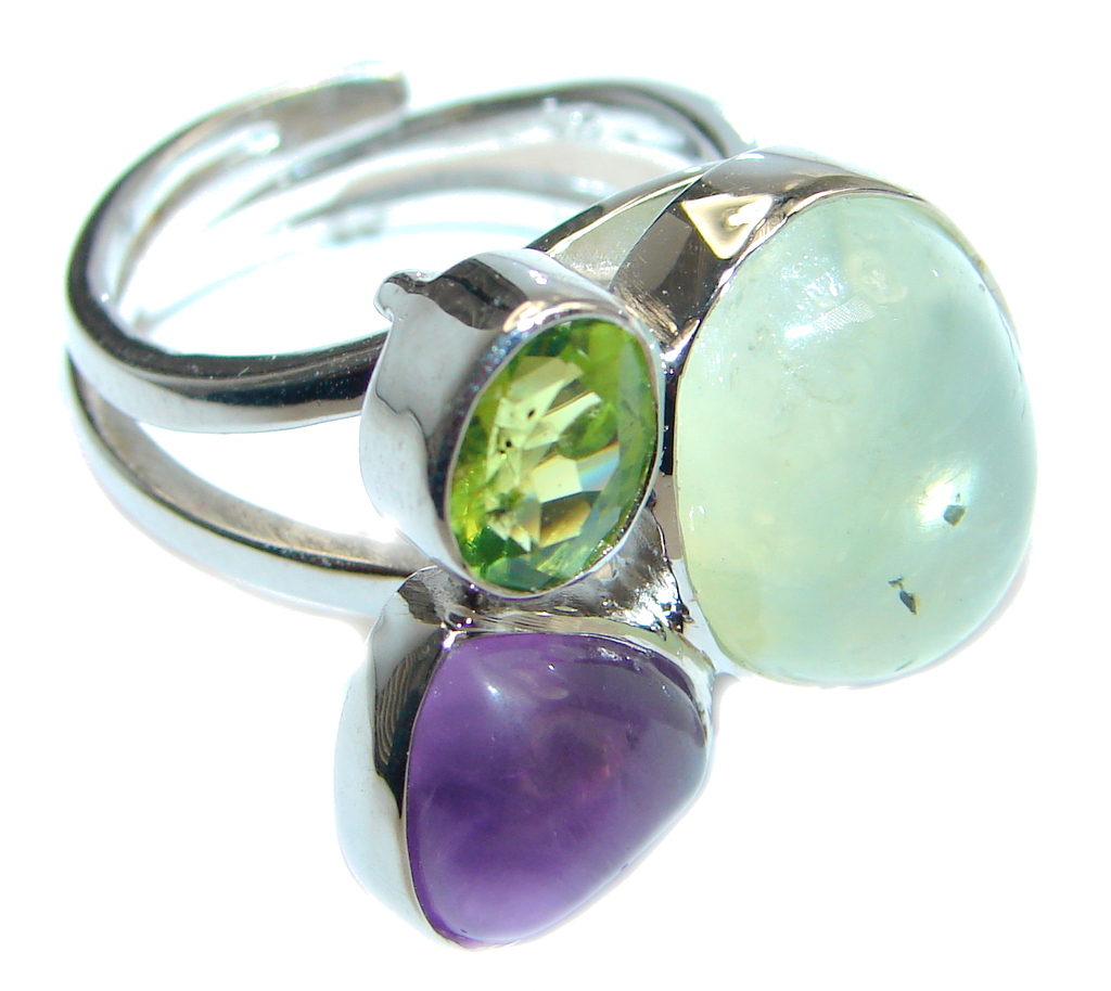 Moss Prehnite Amethyst Peridot Sterling Silver ring; size adjustable