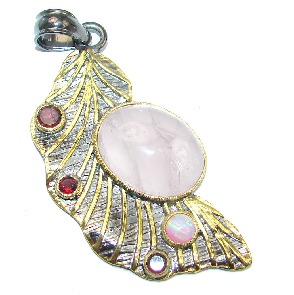 Vintage Style Rose Quartz Garnet Gold Rhodium plated over Sterling Silver Pendant