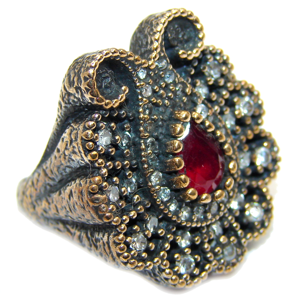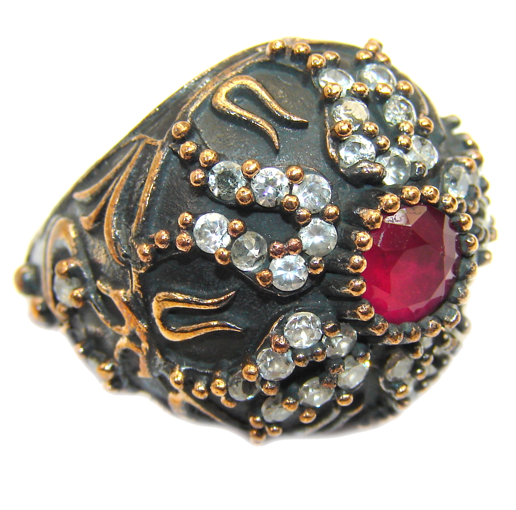 Victorian Style created Ruby & White Topaz Sterling Silver ring; s. 7 1/4