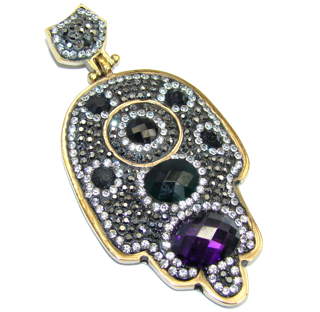 Large Victorian Style Hamsa Hand Onyx & White Topaz Sterling Silver Pendant