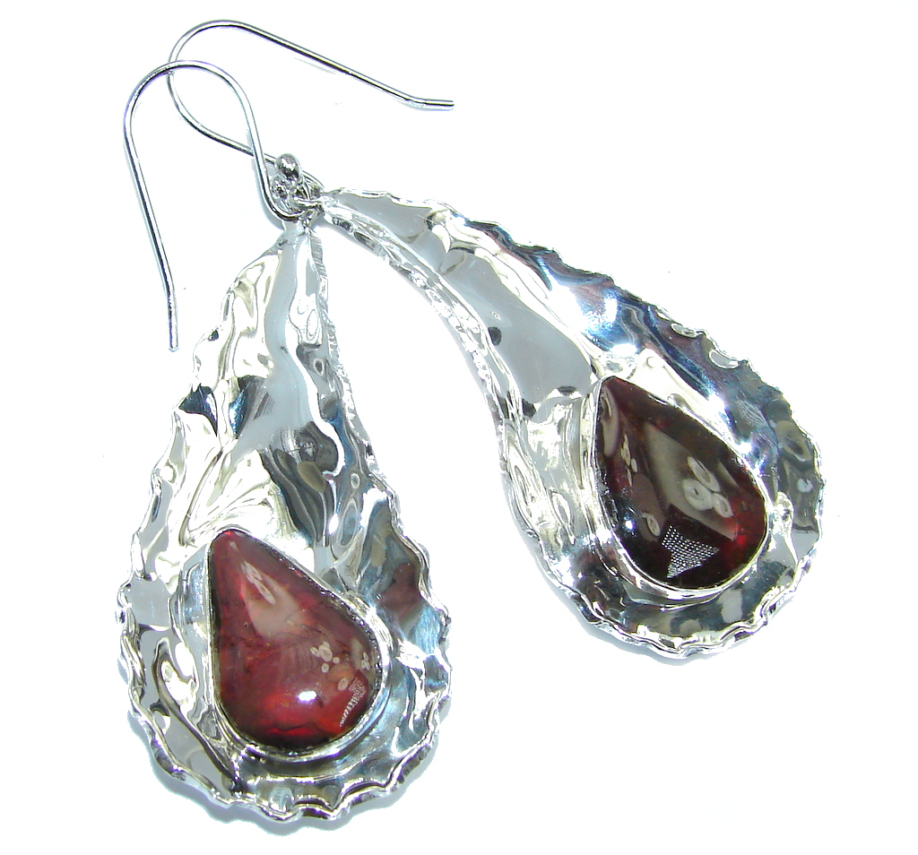 Red Aura AAA+ Fire Ammolite hammered Sterling Silver earrings