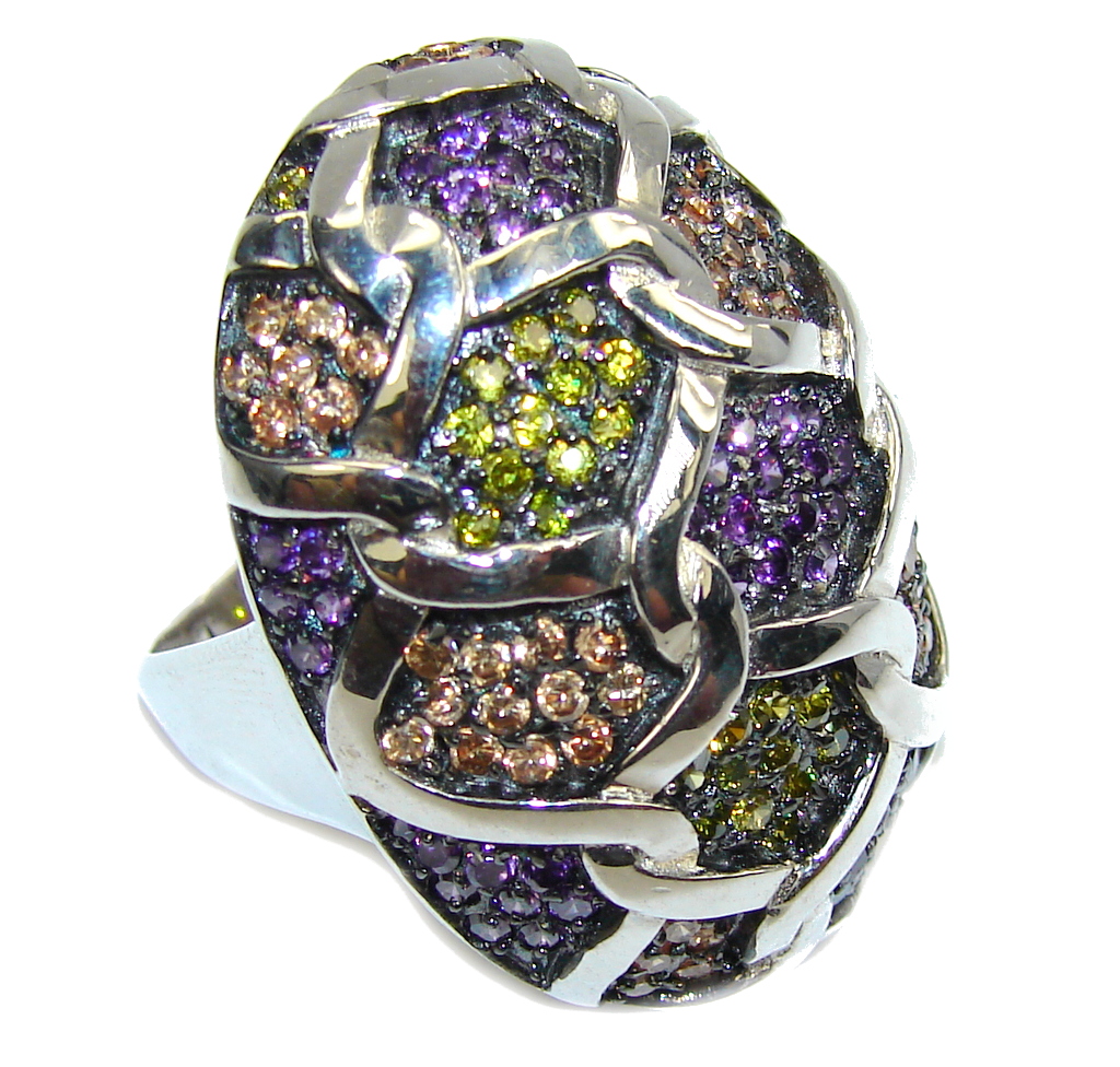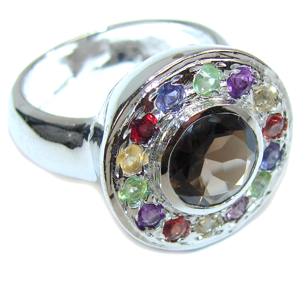 Big! Delicate Purple Amethyst & Smoky Topaz & Garnet Sterling Silver Ring s. 8 -adjustable
