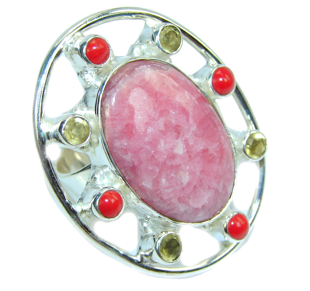 Large! Amazing Pink Rhodochrosite & Citrine & Coral Sterling Silver Ring s. 9