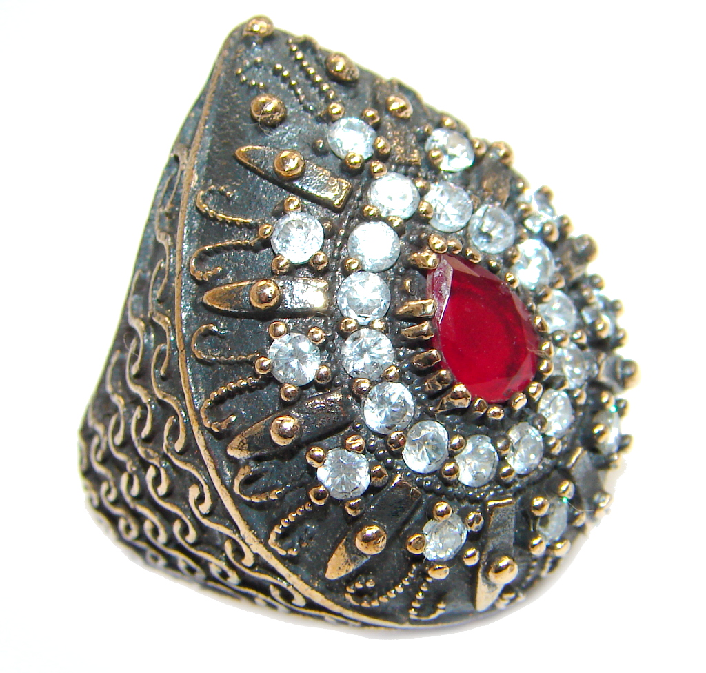 Victorian Style created Ruby & White Topaz Sterling Silver ring; s. 6