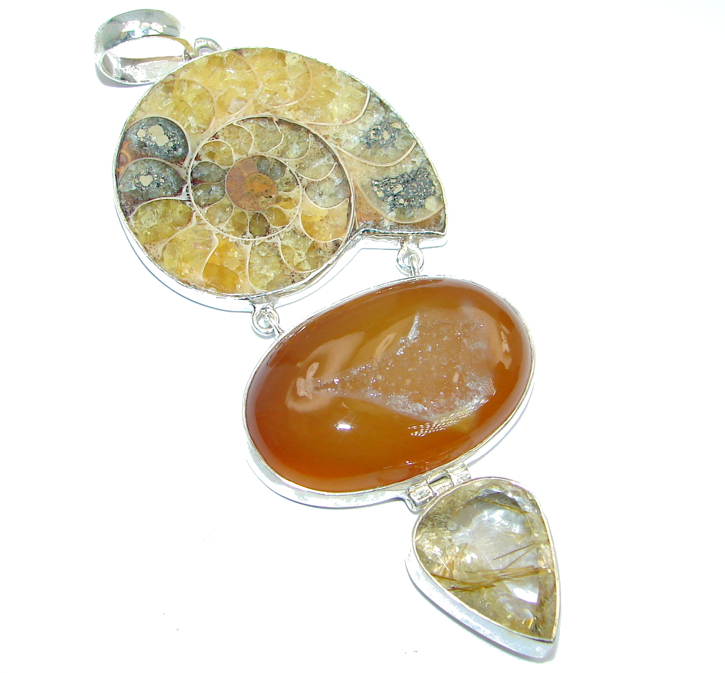 Large 3 3/4 inches long Natual Ammonite Rutilated Quartz Fossil Sterling Silver Pendant
