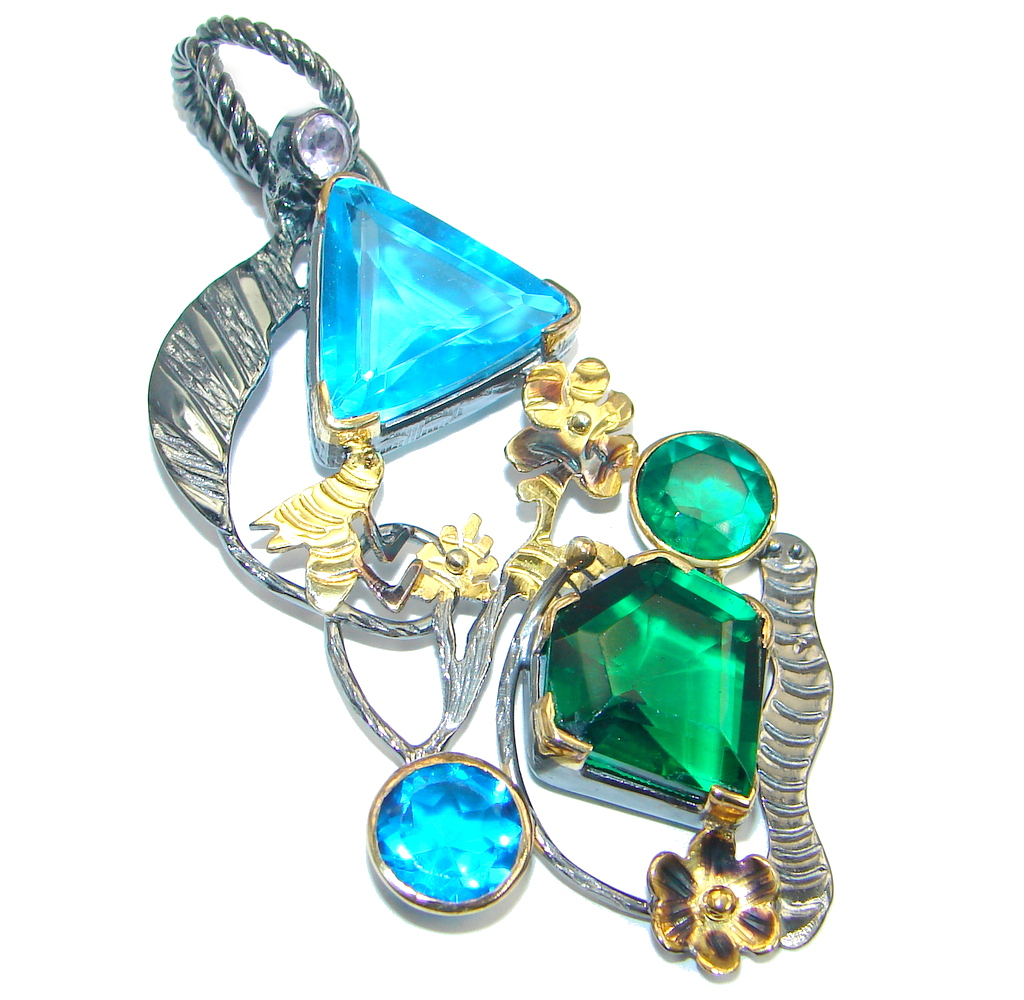 Unique Blue Hydro Glass Gold Rhodium plated over Sterling Silver Pendant