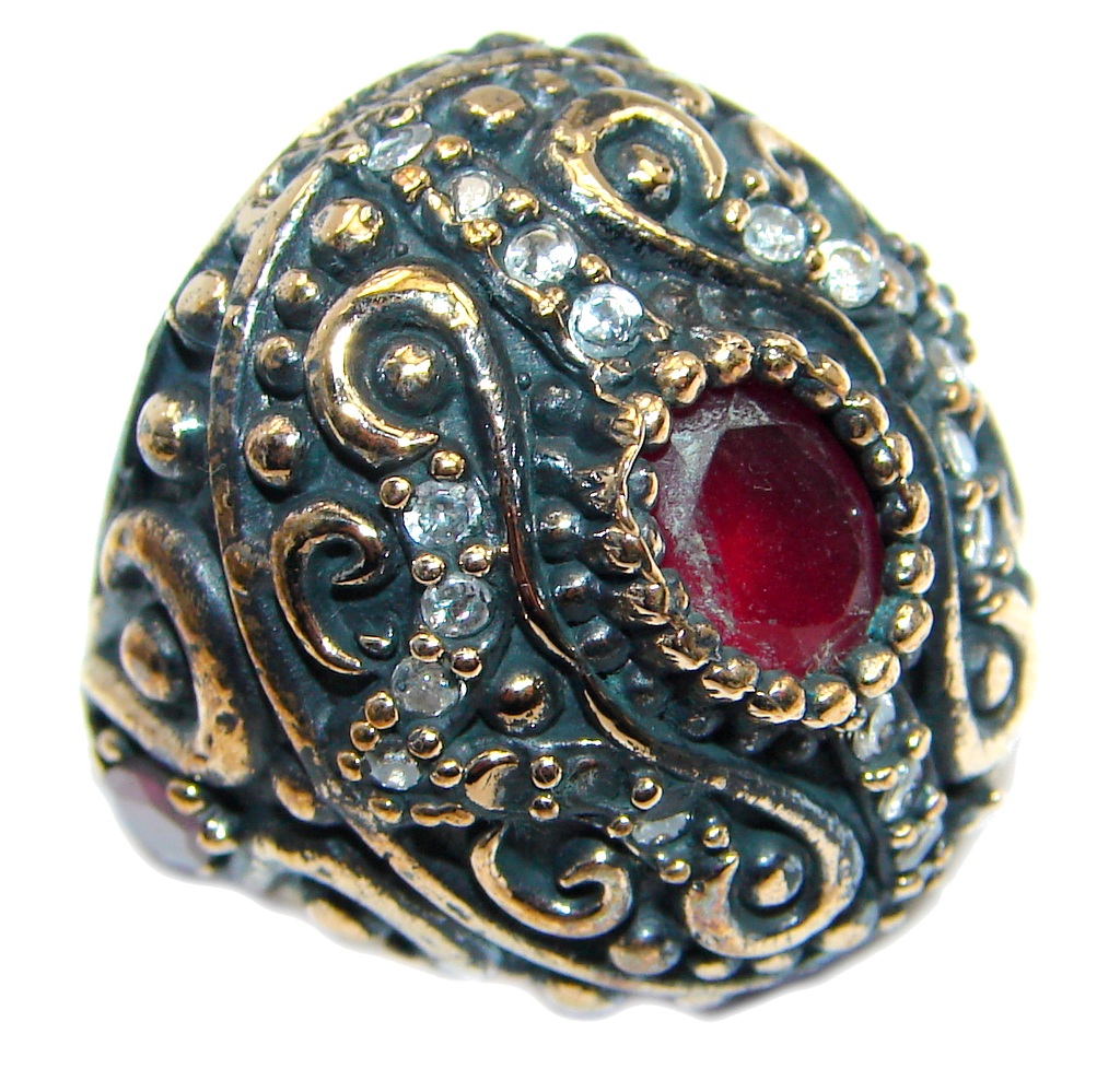 Large Victorian Style created Ruby & White Topaz Sterling Silver ring; s. 6