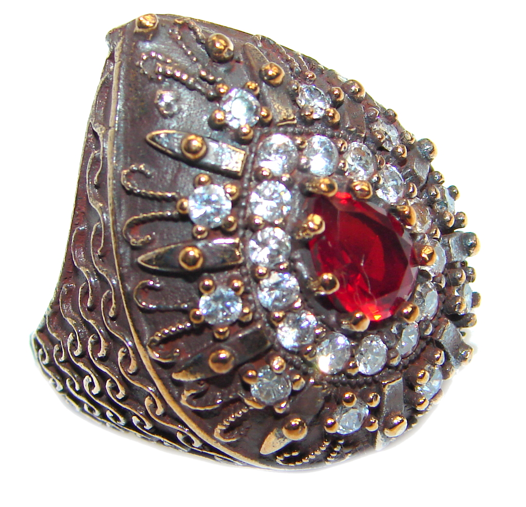 Large Victorian Style created Ruby & White Topaz Sterling Silver ring; s. 7 1/4