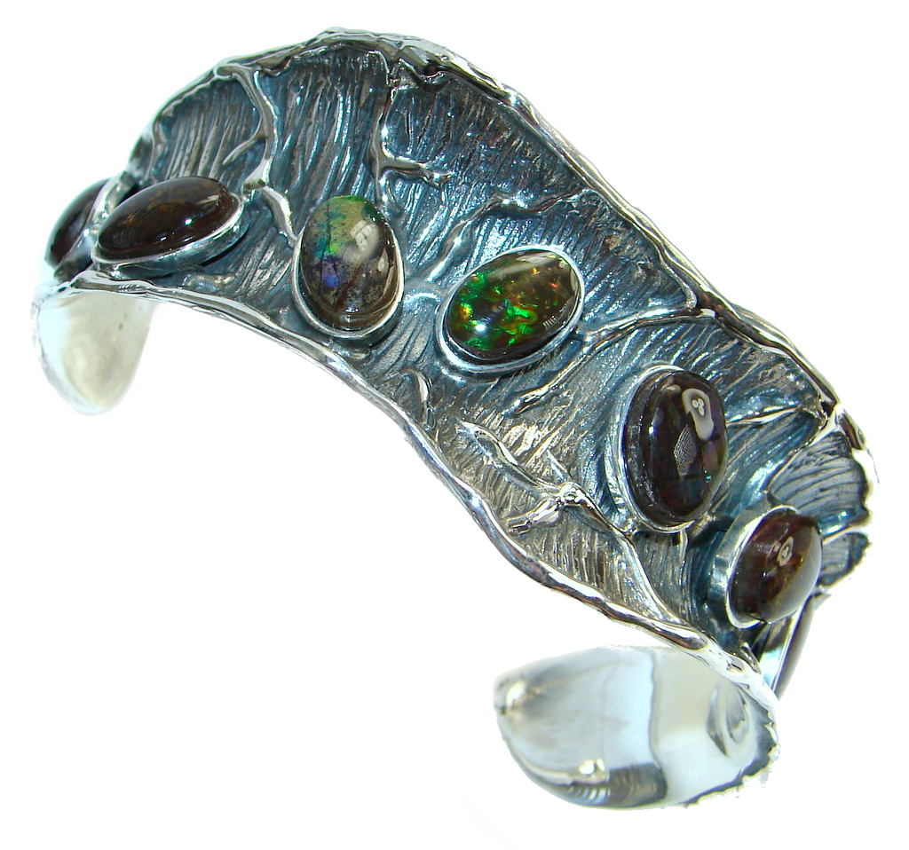 Natural AAA+ Canadian Ammolite from Aurora Ammolite Mine in Alberta Two Tones Sterling Silver handmade Bracelet