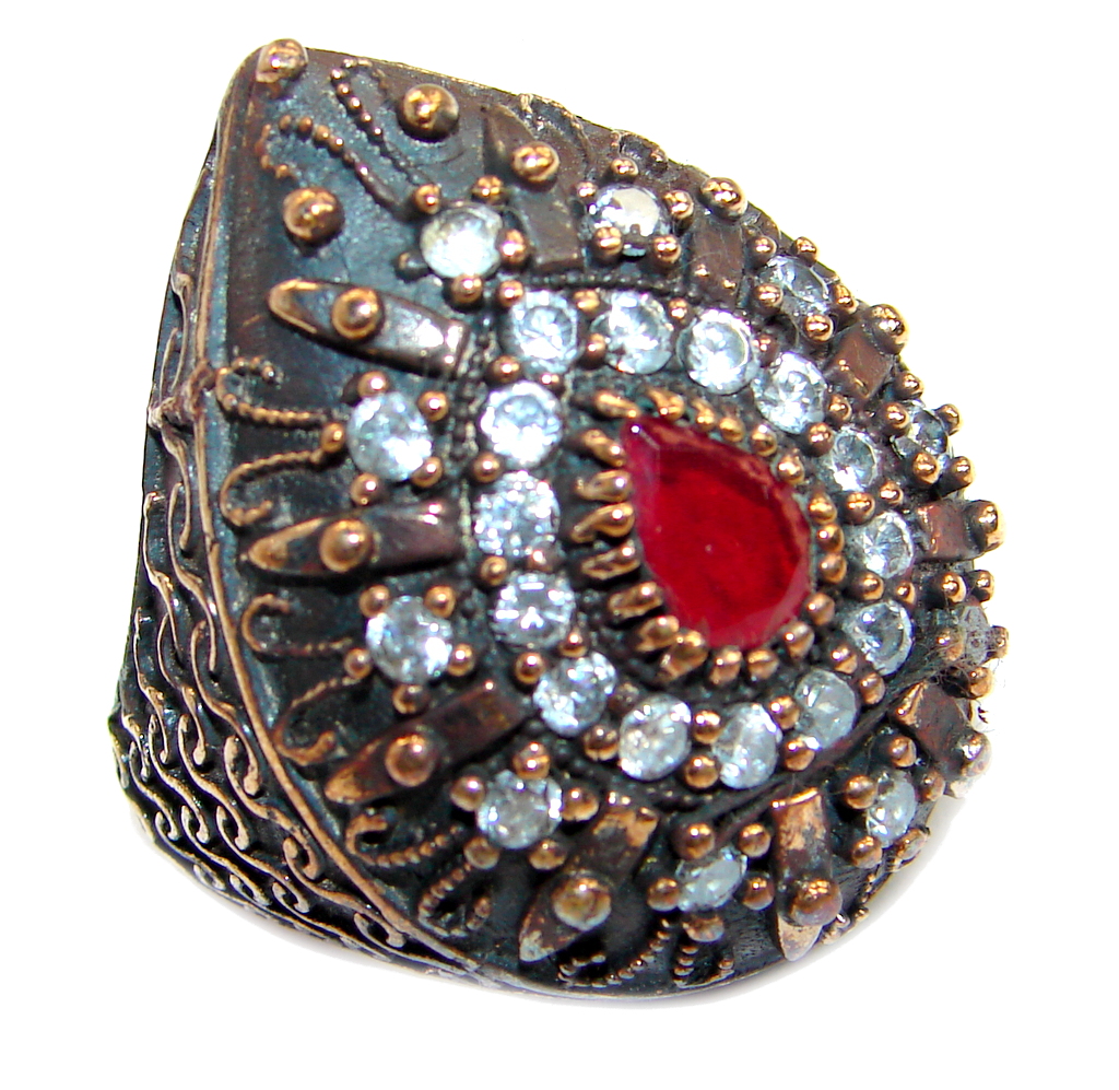 Large Victorian Style created Ruby & White Topaz Sterling Silver ring; s. 6 1/4