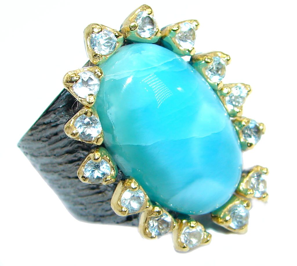 Giant Flower Design Genuine Larimar Two tones .925 Sterling Silver handcrafted Ring s. 10