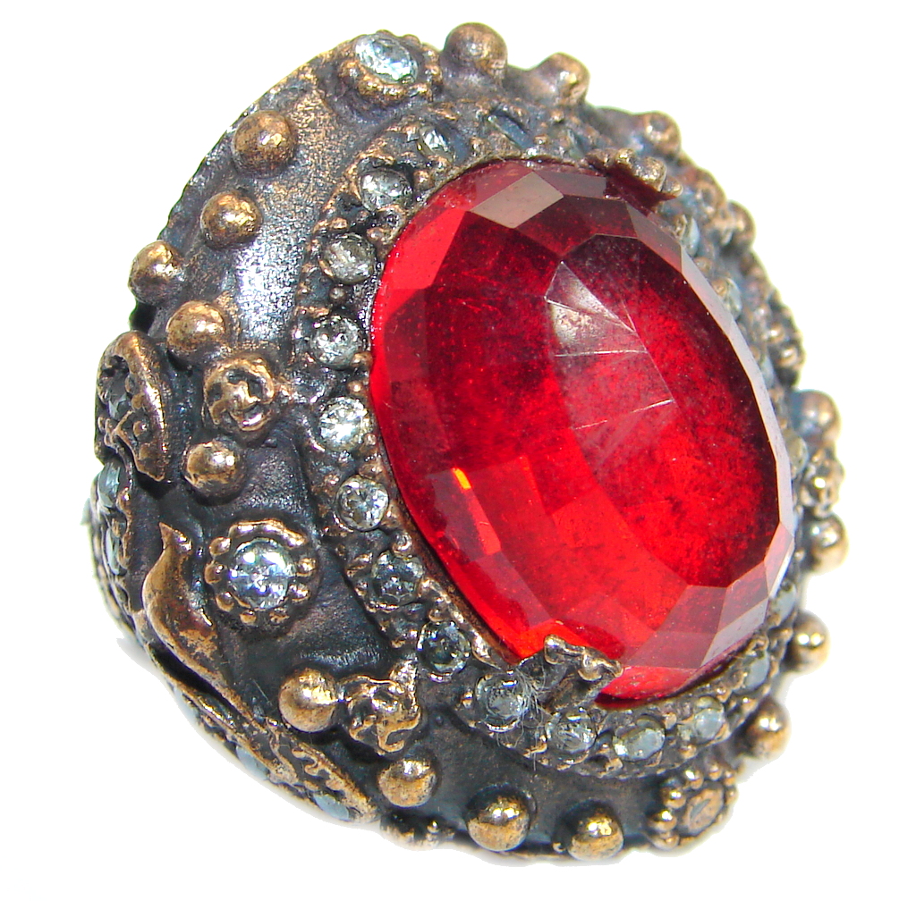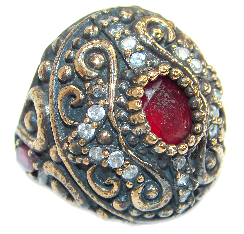 Large Victorian Style created Ruby & White Topaz Sterling Silver ring; s. 7 1/4
