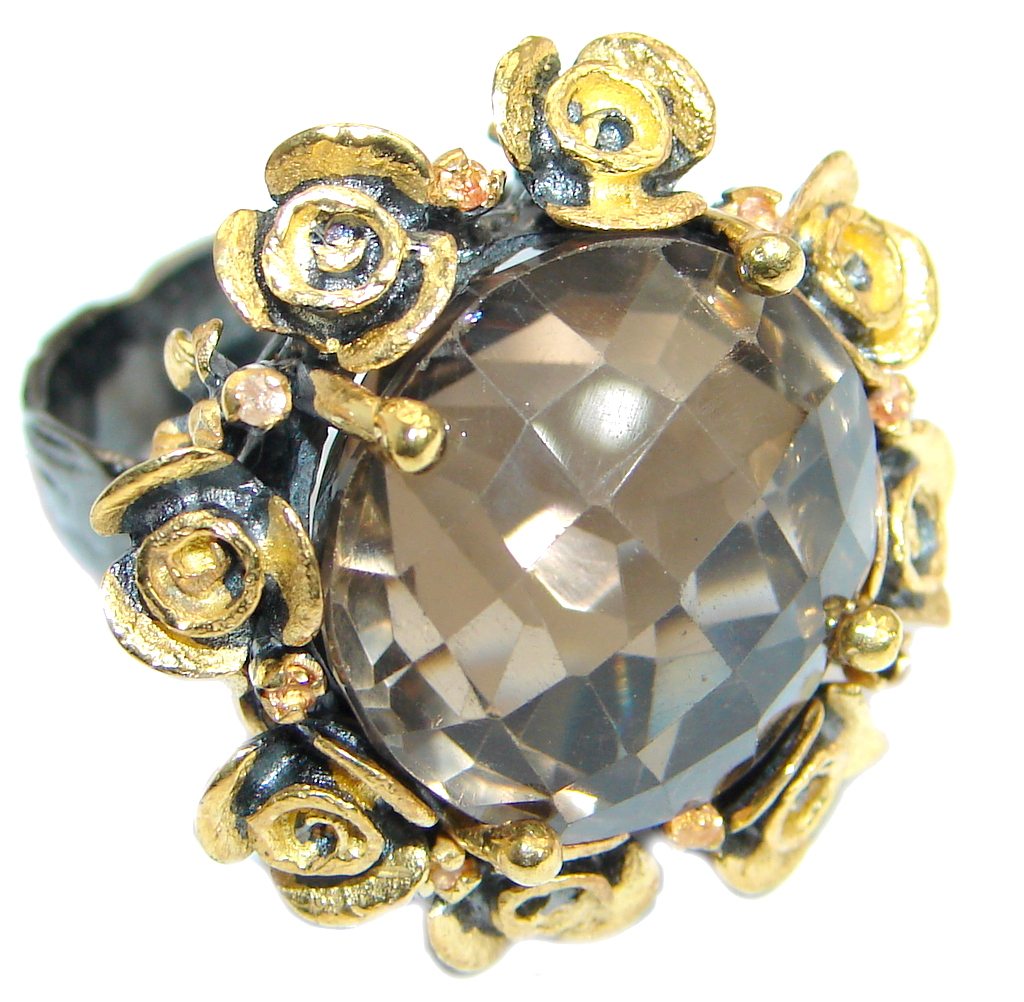 Huge Floral Design Smoky Topaz Gold over .925 Sterling Silver Cocktail ring s. 7 1/4