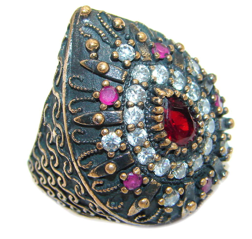 Large Victorian Style created Ruby & White Topaz Sterling Silver ring; s. 7