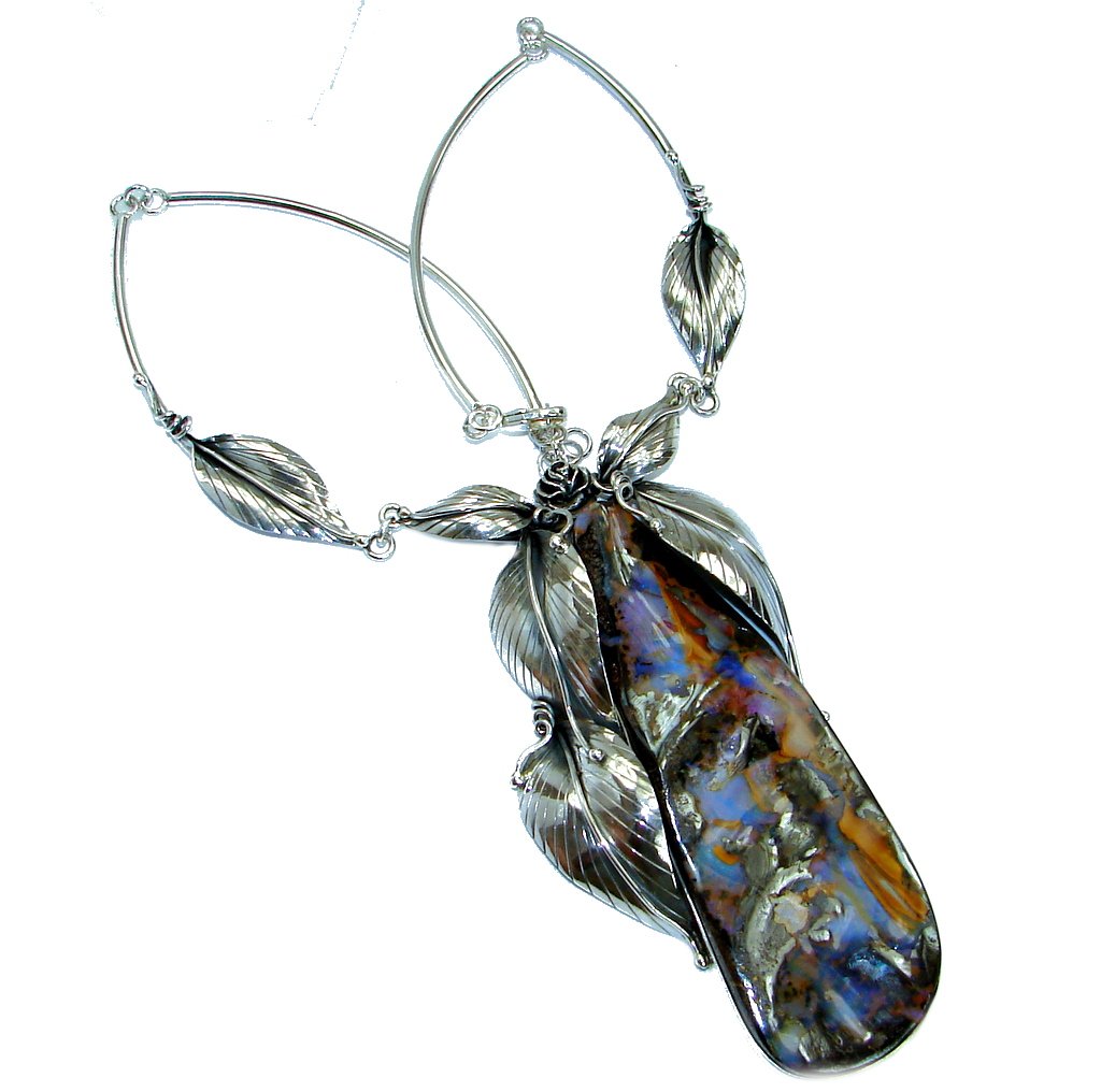 Large 4 5/8 inches genuine Australian Boulder Opal .925 Sterling Silver brilliantly handcrafted necklace