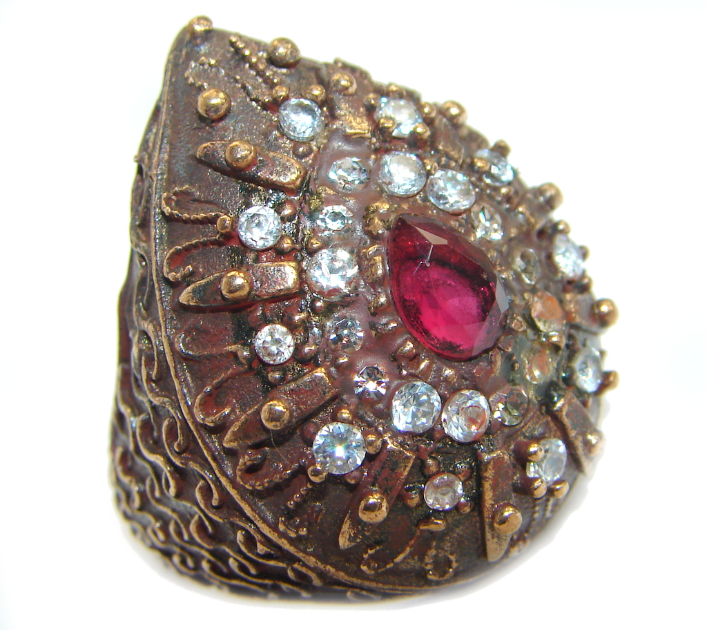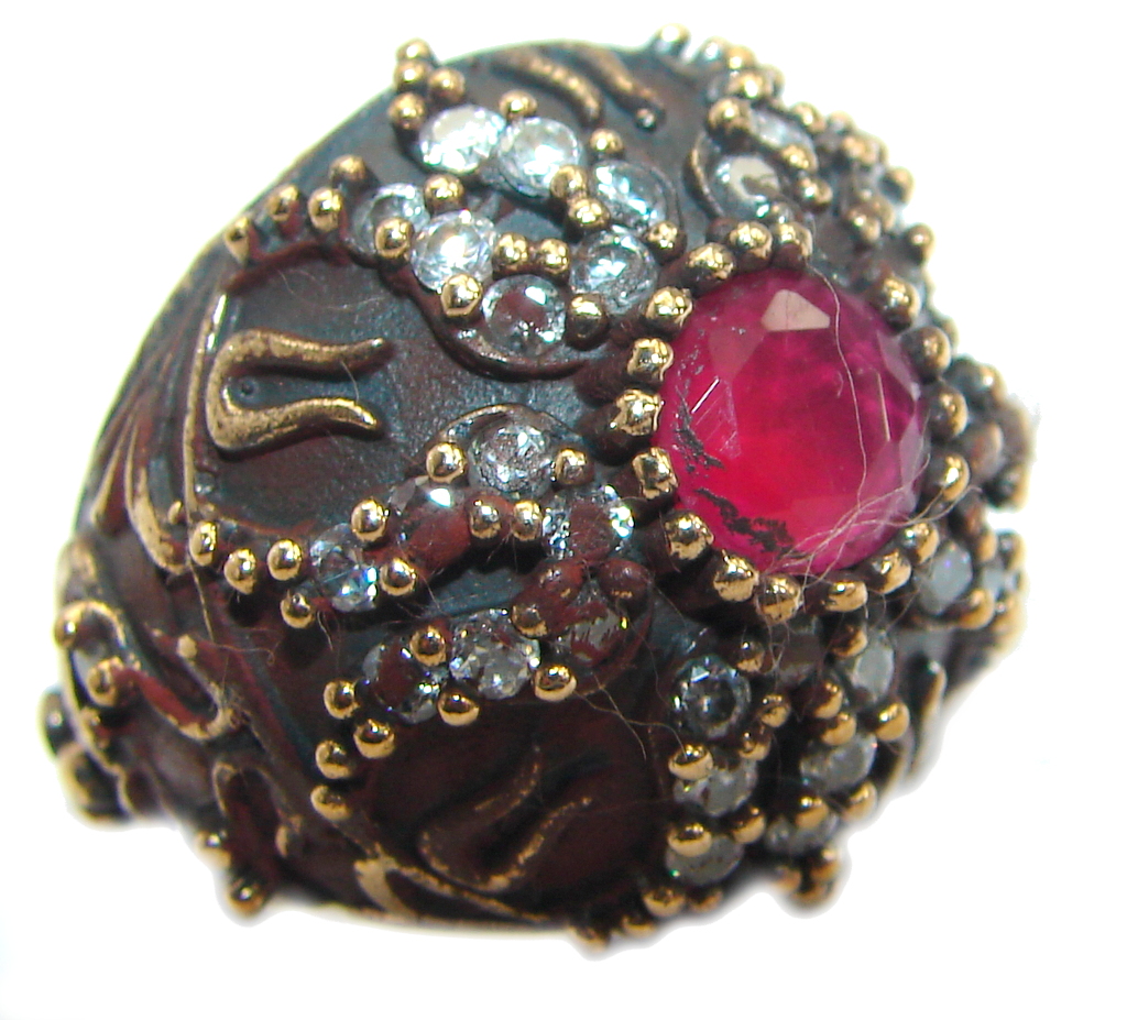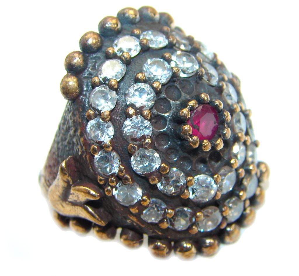 Large Victorian Style created Ruby & White Topaz Sterling Silver ring; s. 7