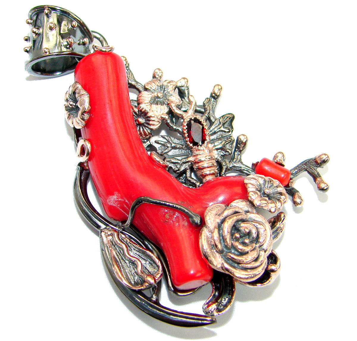 Huge Authentic Fossilized Coral Gold Rhodium over .925 Coral Sterling Silver handmade pendant