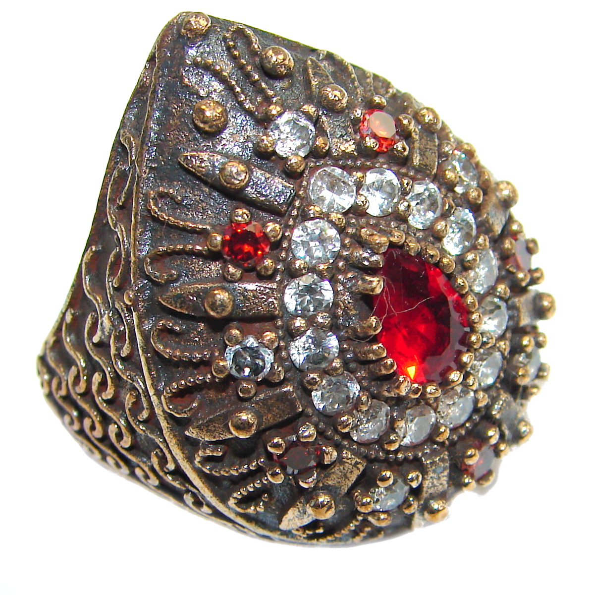 Large Victorian Style created Ruby & White Topaz Sterling Silver ring; s. 7 1/4