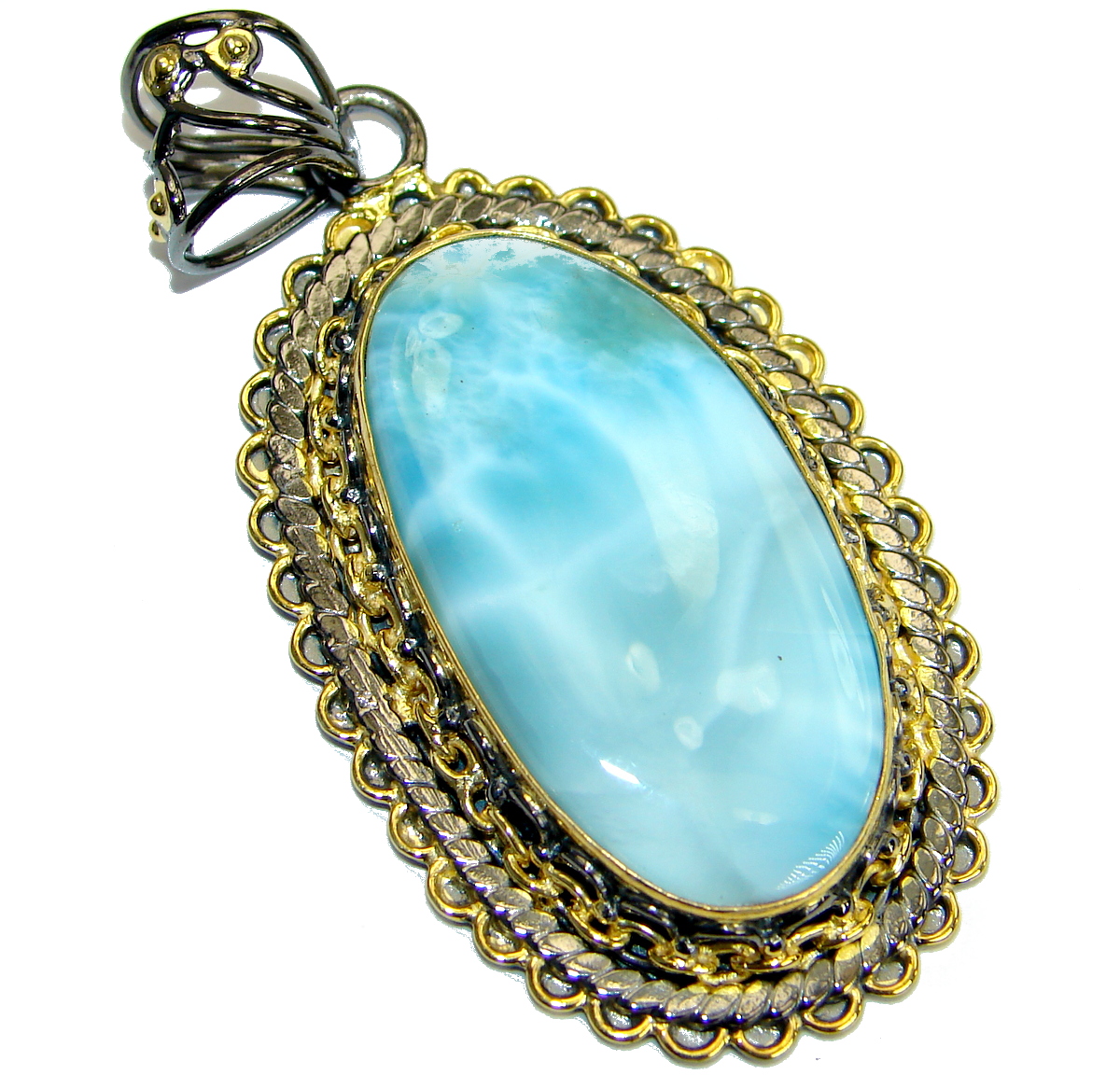 Vintage Design Larimar 14K Gold Rhodium over .925 Sterling Silver handmade pendant