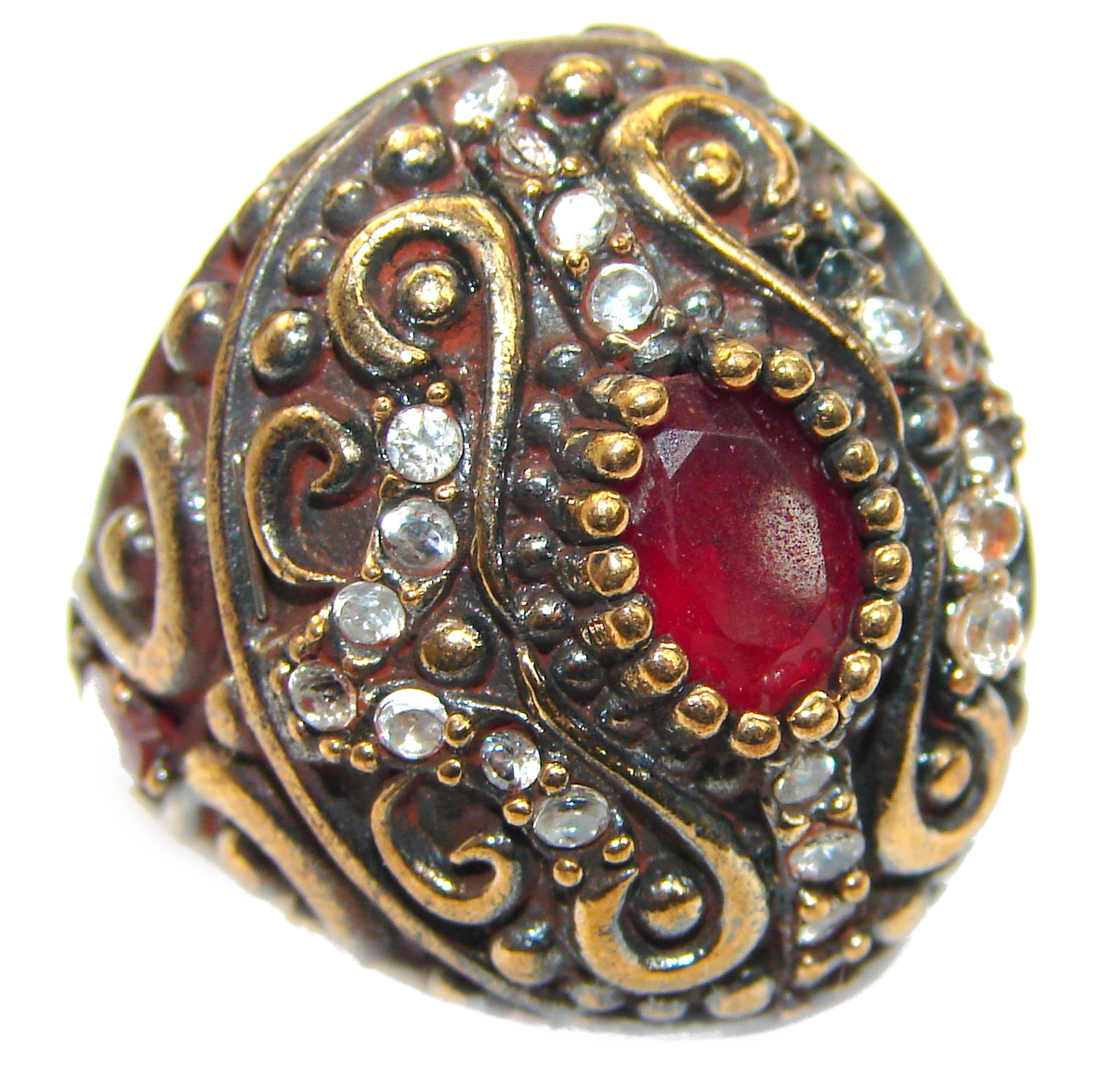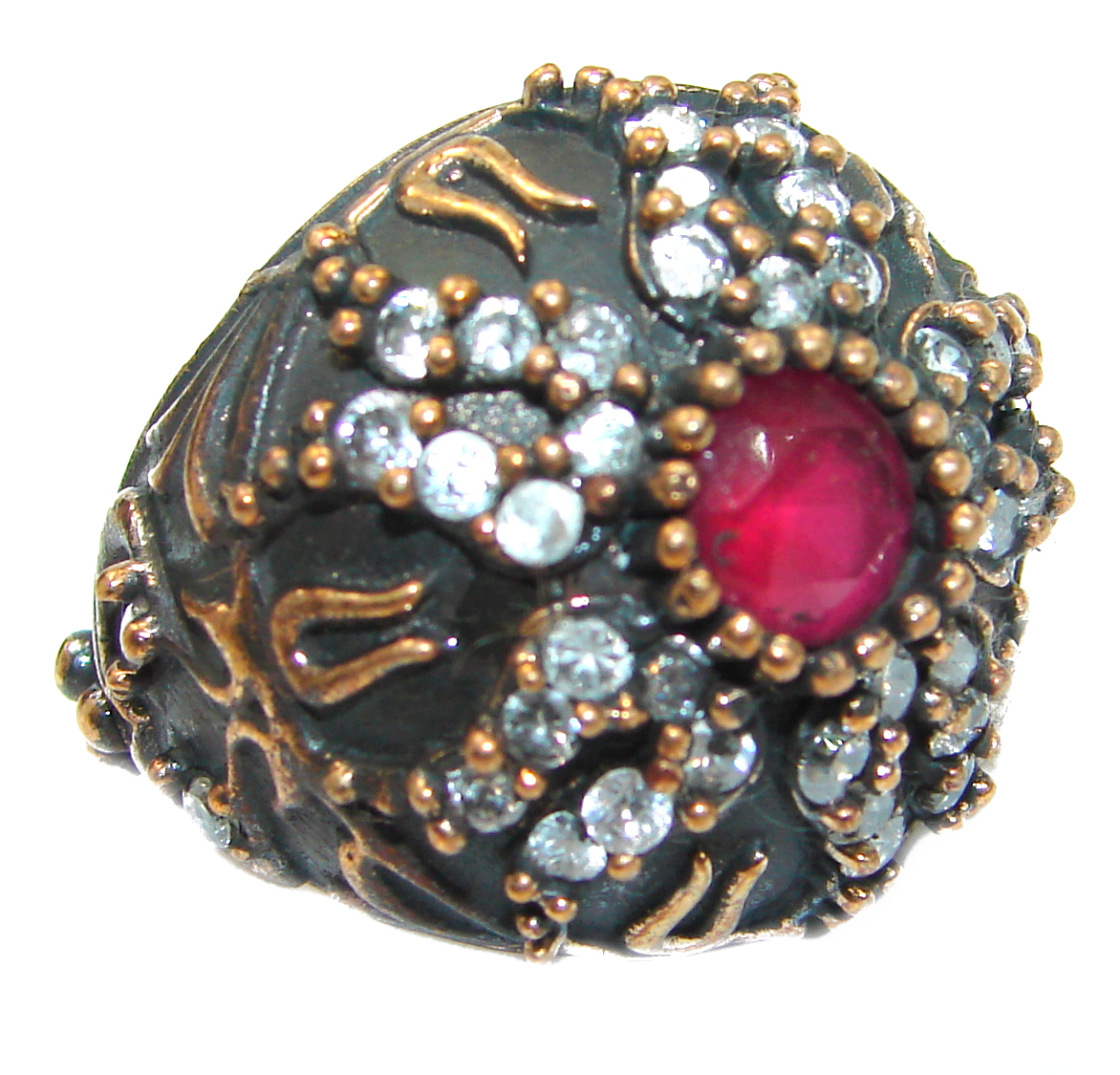Large Victorian Style created Ruby & White Topaz Sterling Silver ring; s. 7