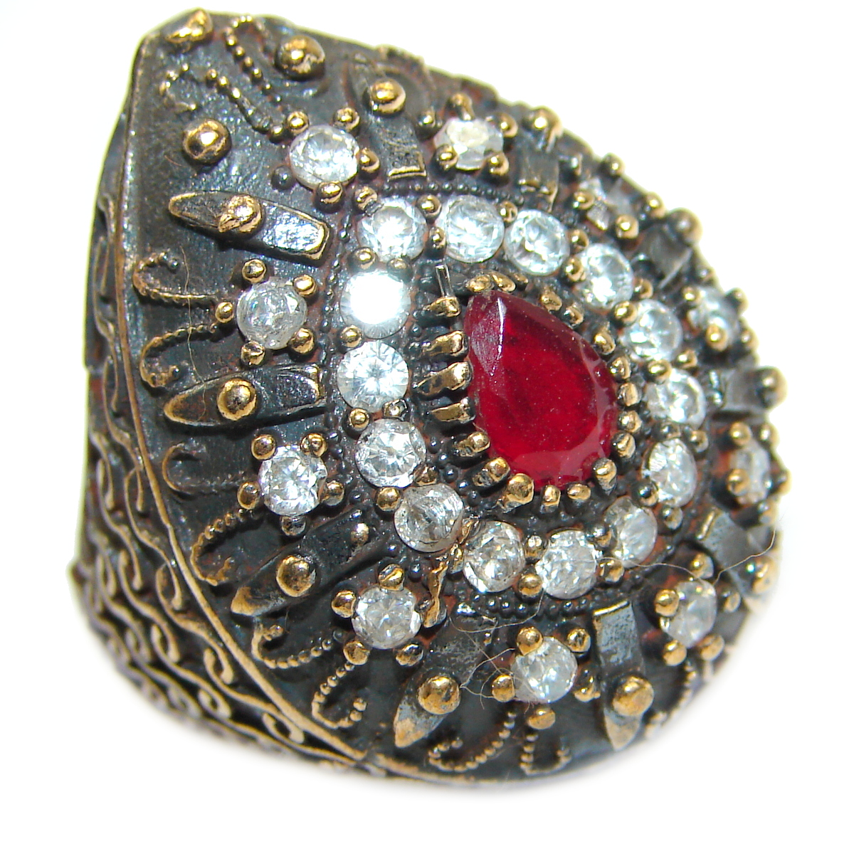 Large Victorian Style created Ruby & White Topaz Sterling Silver ring; s. 6