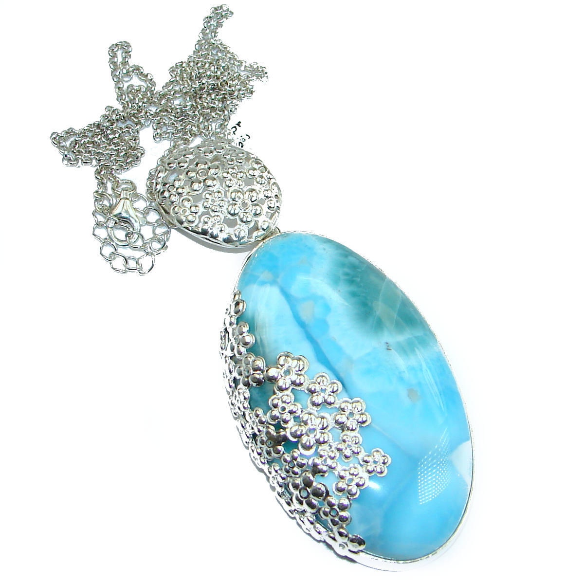 Ocean Halo 150CT genuine Larimar .925 Sterling Silver handmade necklace