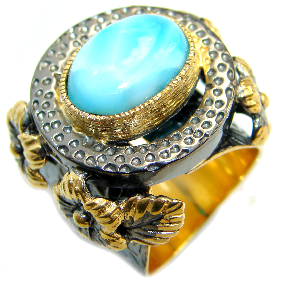 Treasure Blue Larimar two tones .925 Sterling Silver handmade ring s. 7 adjustable