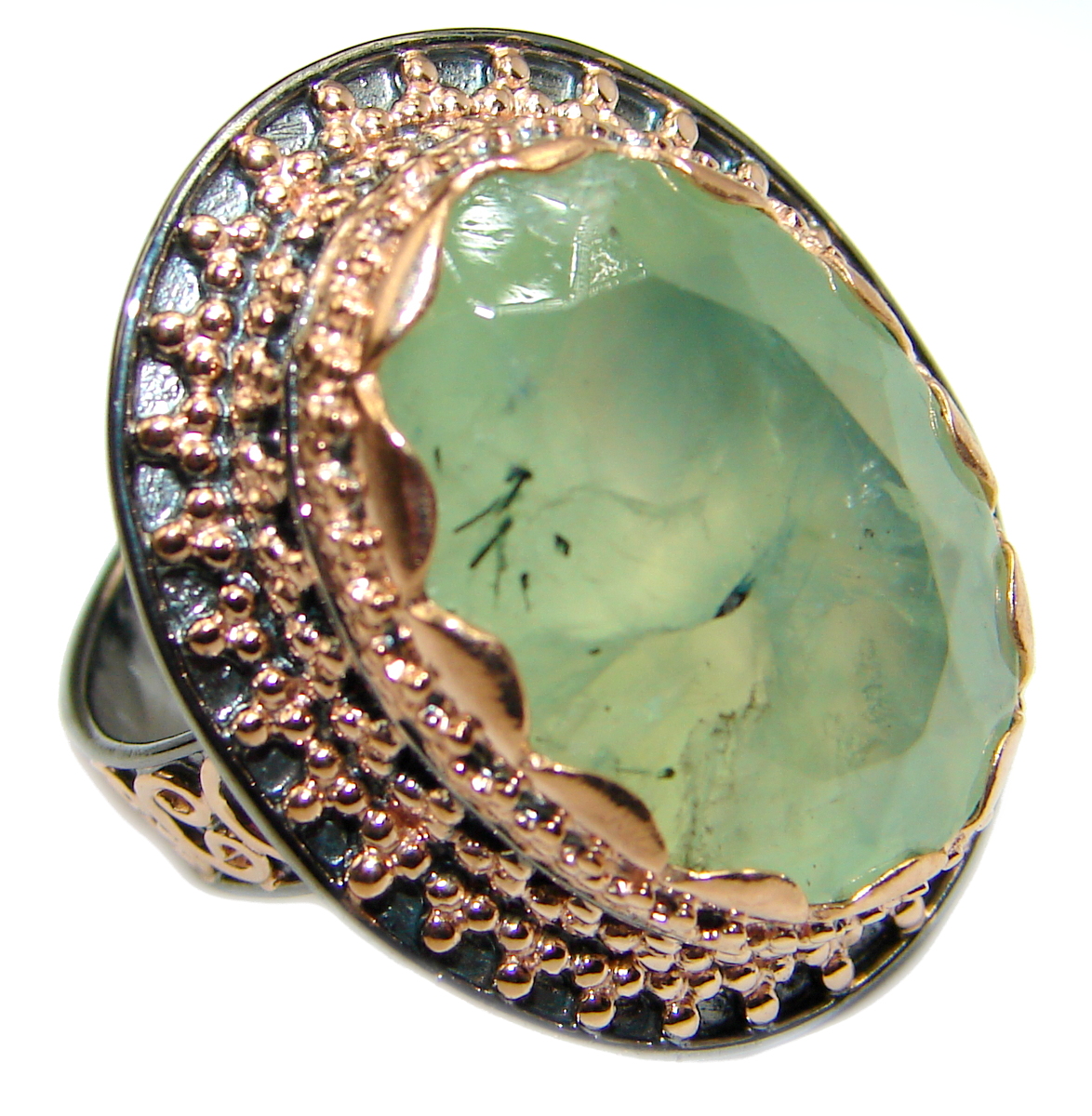 Natural Moss Prehnite oxidized .925 Sterling Silver handmade ring s. 8 adjustable