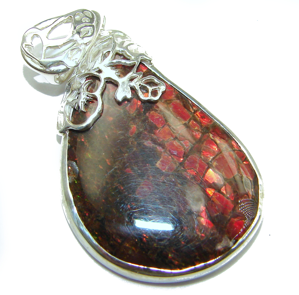 One of the kind genuine Ammolite .925 hammered Sterling Silver Pendant