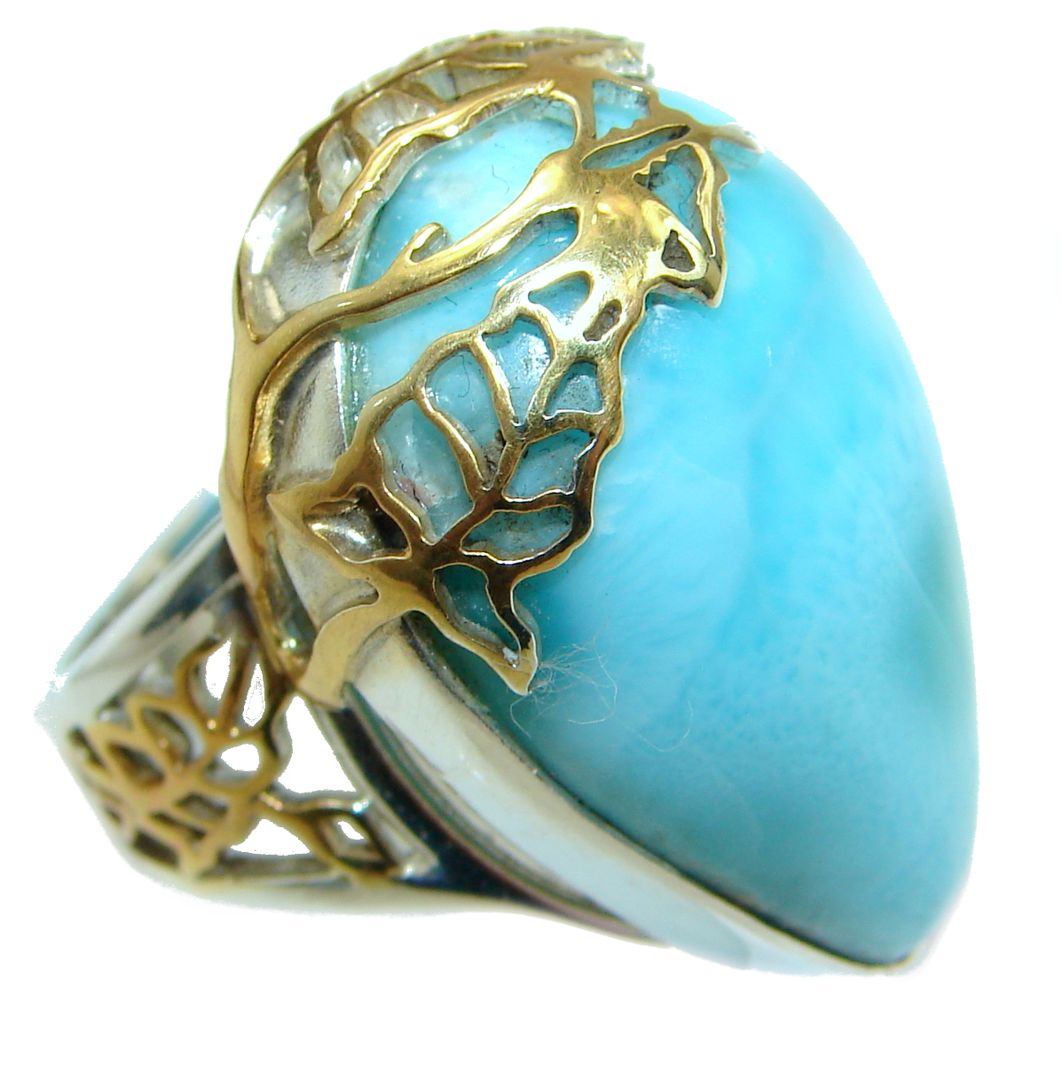 Blue Treasure Larimar two tones .925 Sterling Silver handmade ring s. 7 adjustable