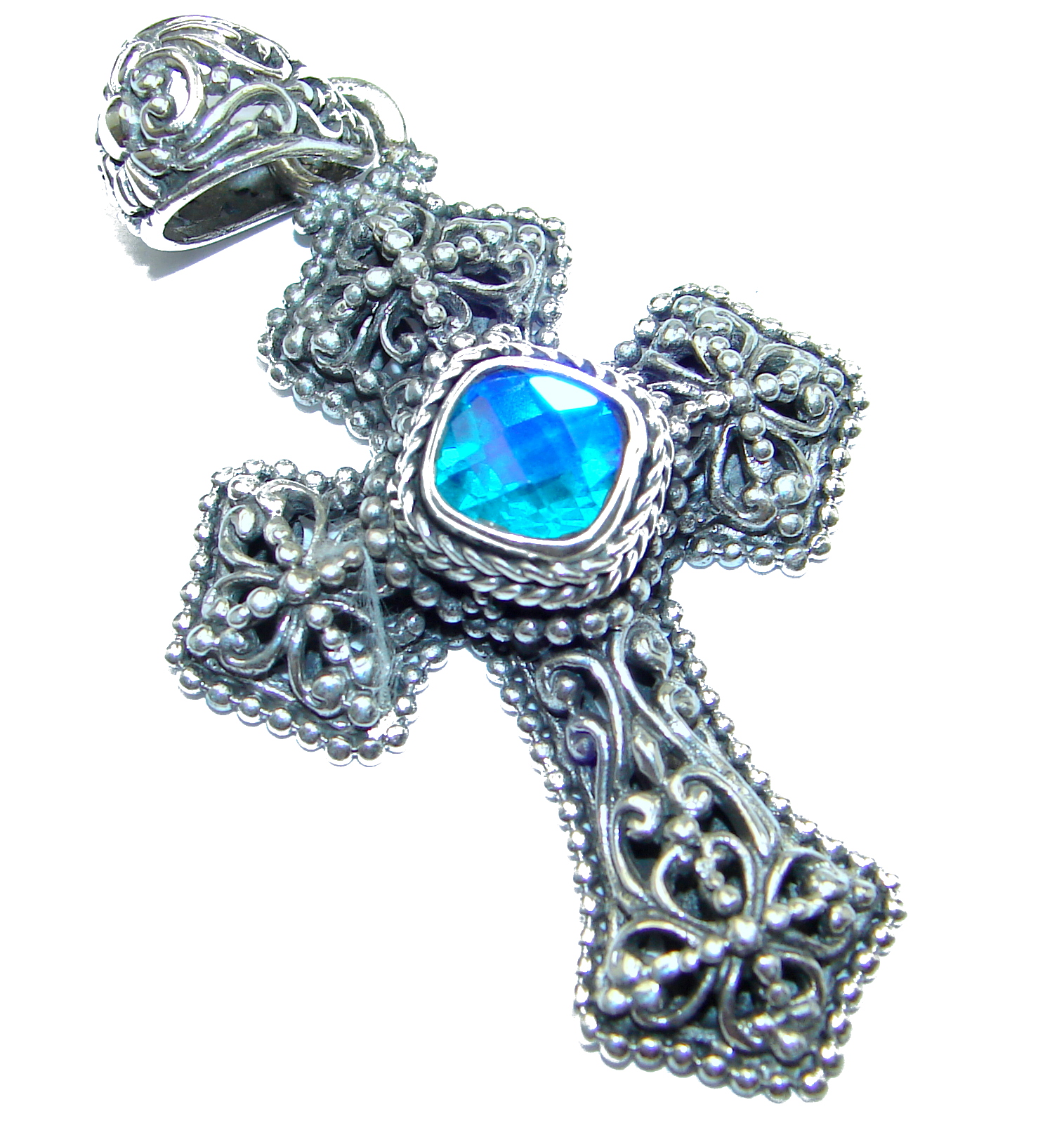 Holy Cross genuine Blue Aqua Topaz .925 Sterling Silver handmade pendant