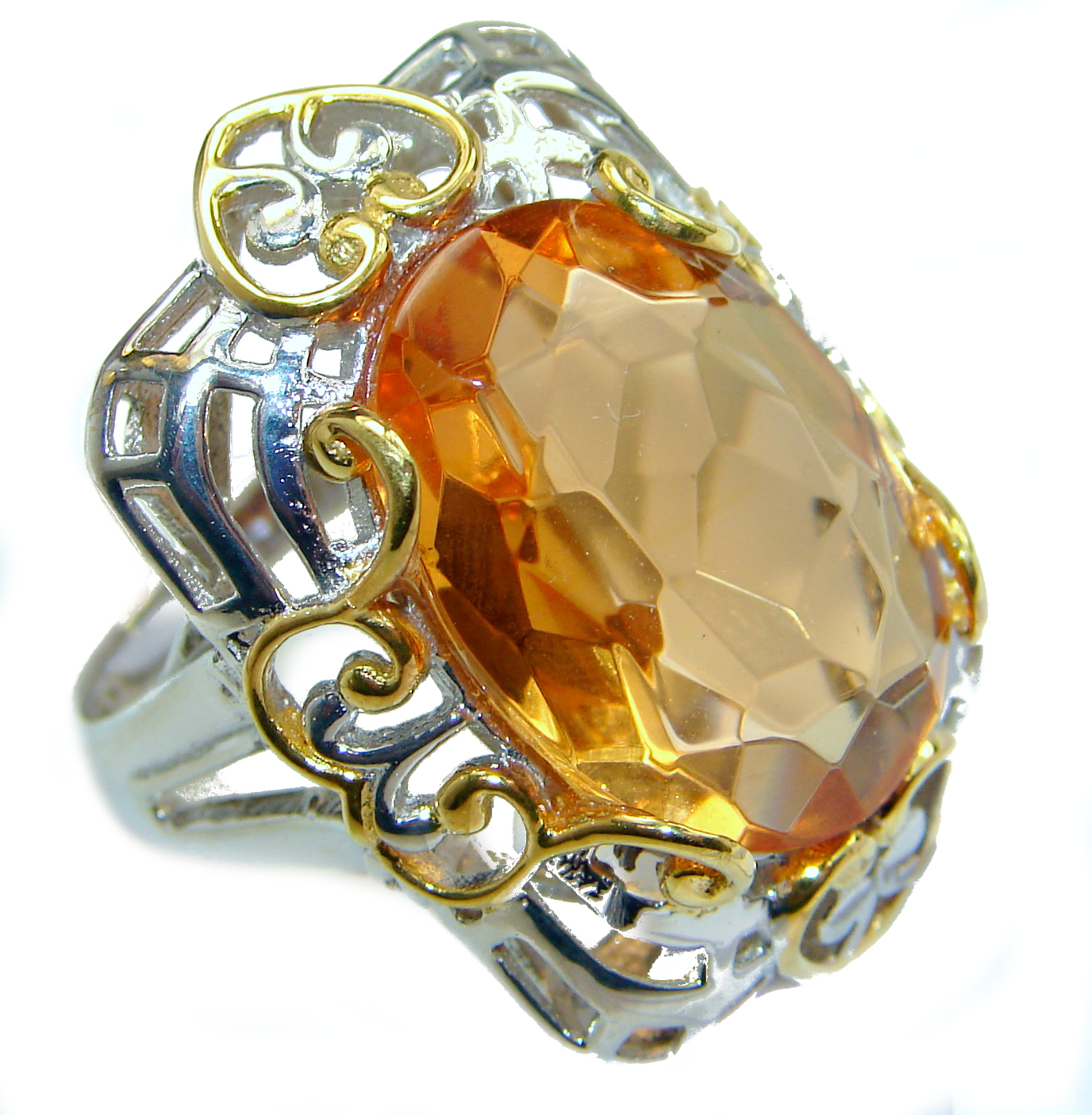 Golden color Quartz Topaz two tones .925 Sterling Silver handcrafted Ring s. 7 1/2