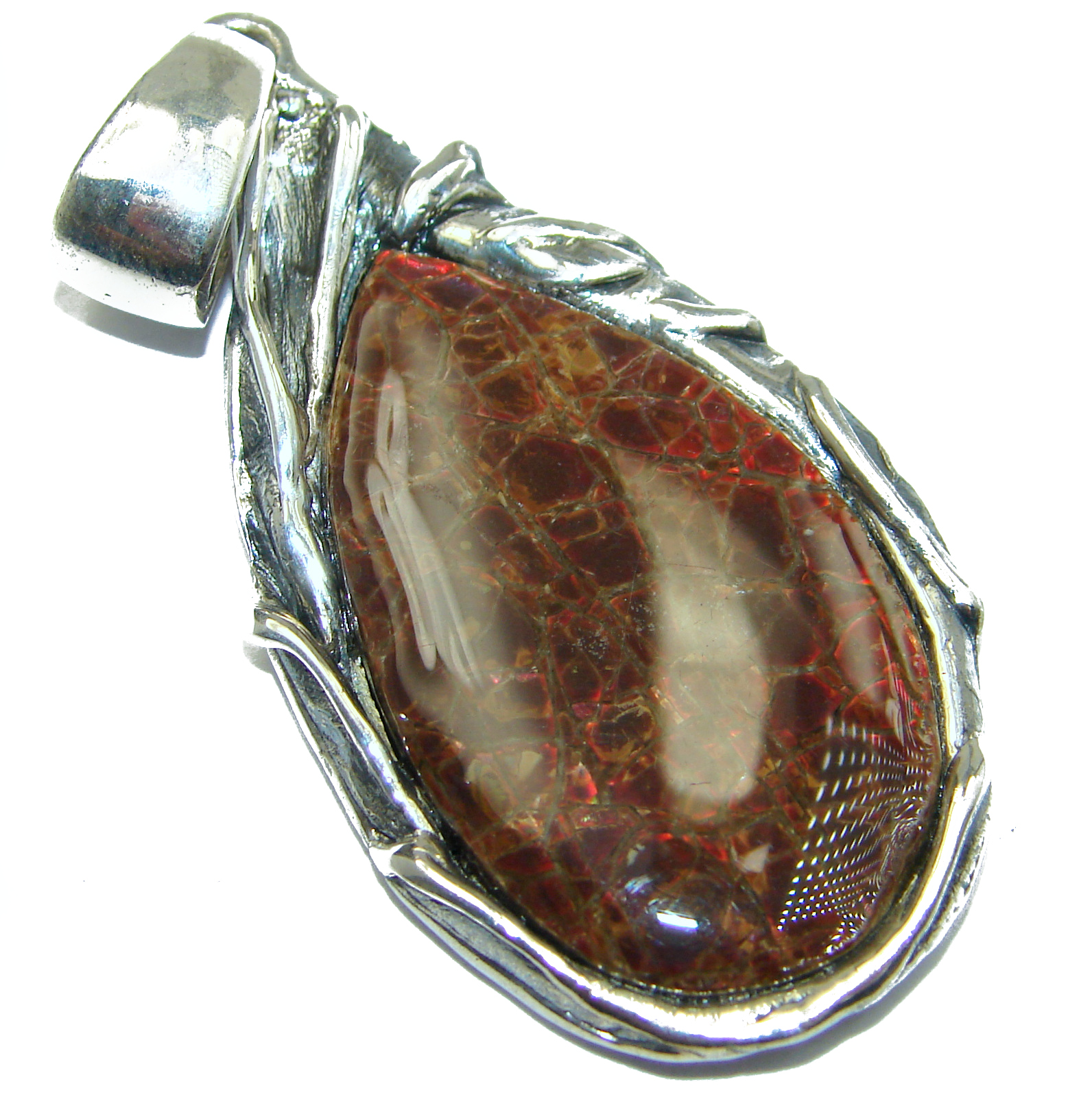 One of the kind genuine Ammolite .925 hammered Sterling Silver Pendant