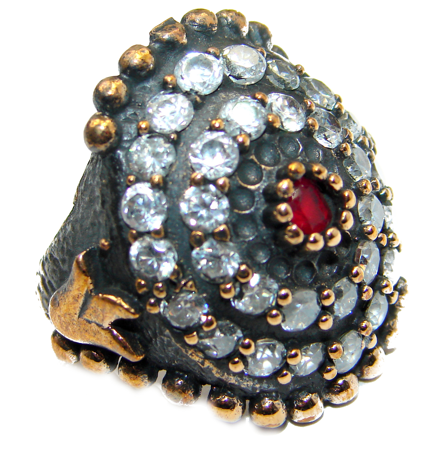 Large Victorian Style created Ruby & White Topaz Sterling Silver ring; s. 6 3/4