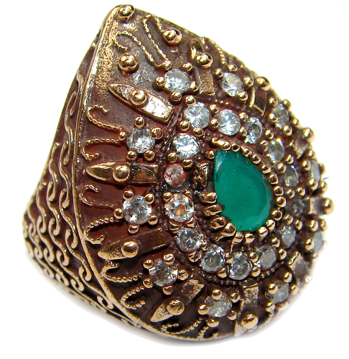 Victorian Style created Emerald & White Topaz Copper over Sterling Silver ring; s. 6 1/4