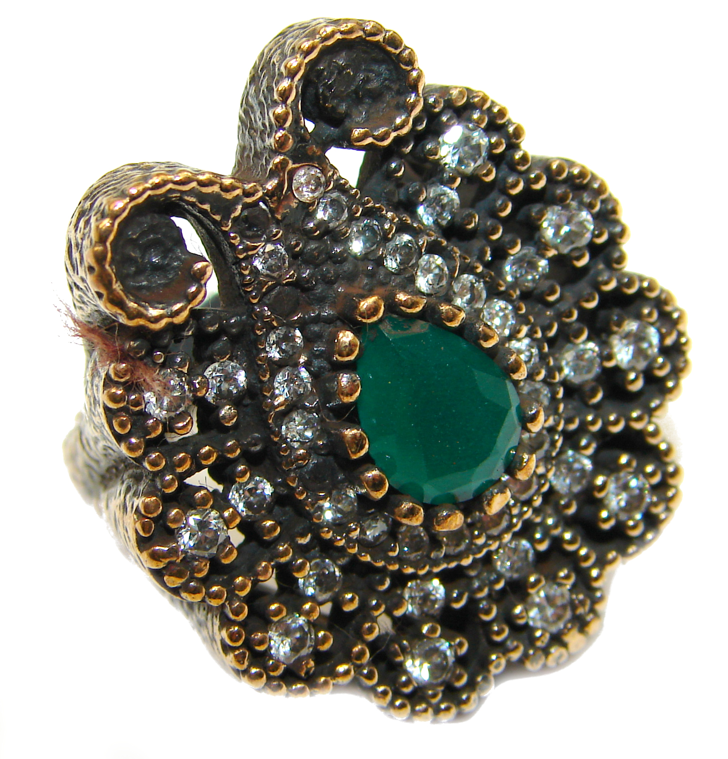 Victorian Style created Emerald & White Topaz Copper over Sterling Silver ring; s. 6 3/4