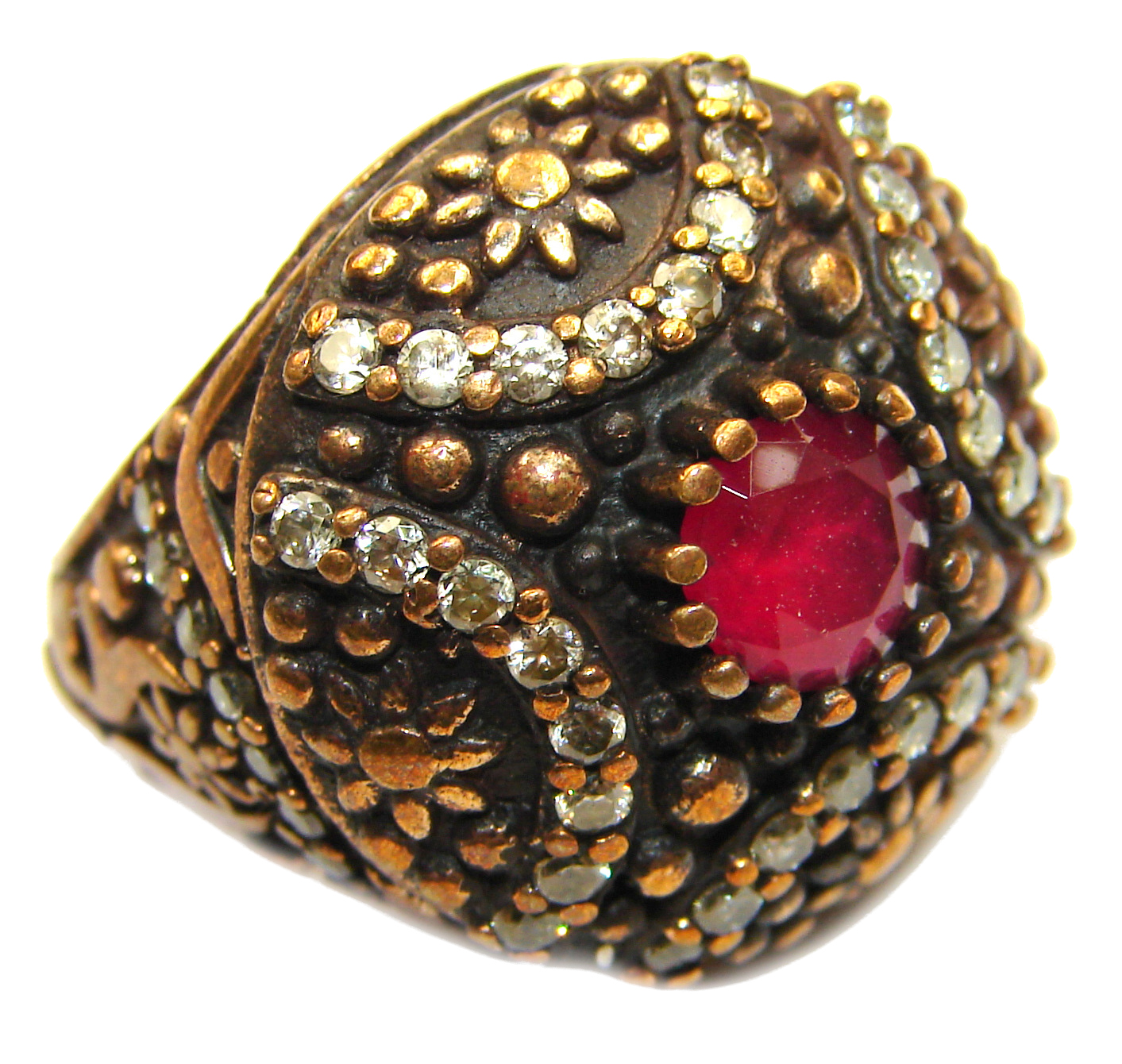 Large Victorian Style created Ruby & White Topaz Sterling Silver ring; s. 6 1/2