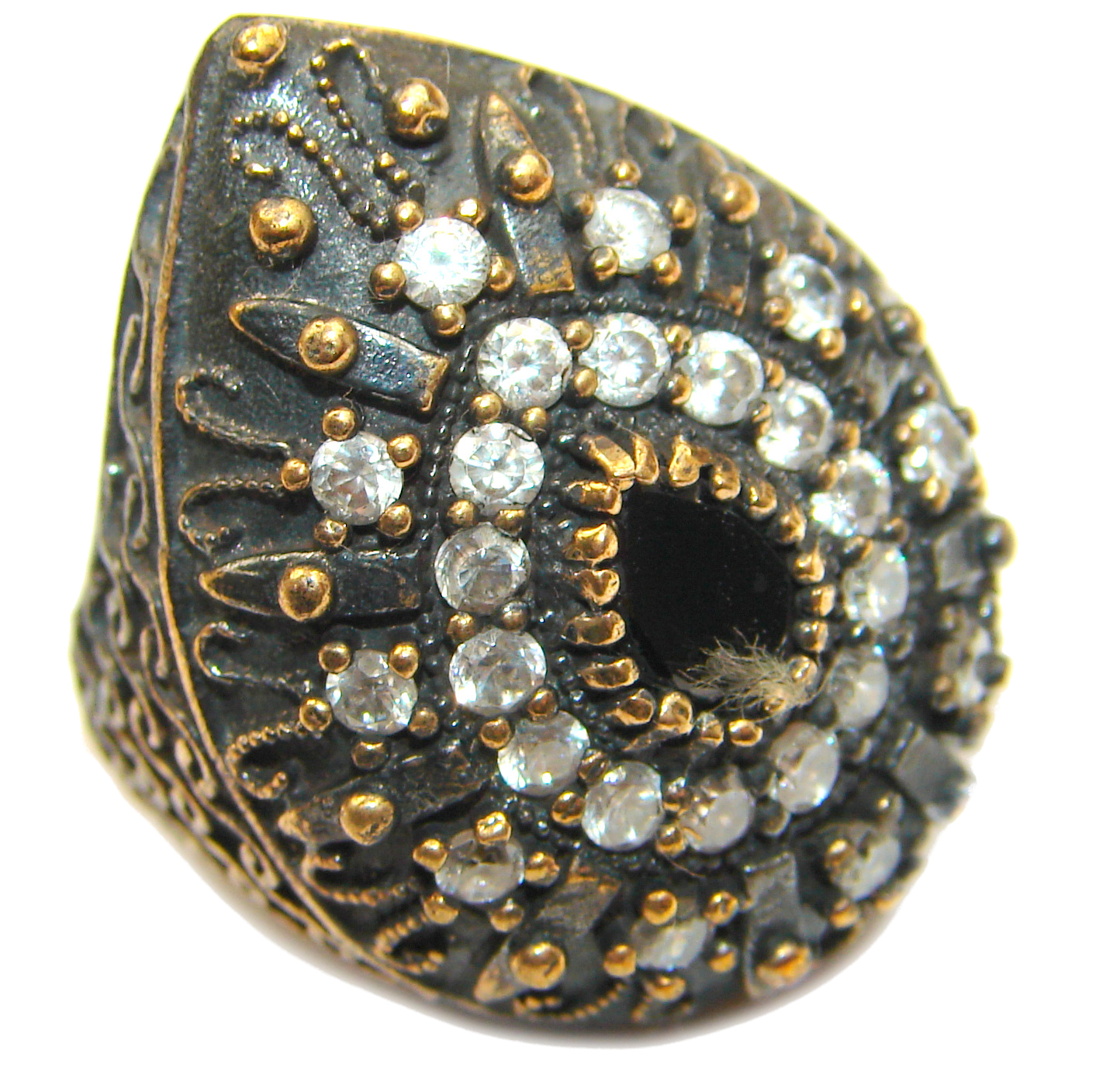 Large Victorian Style Onyx & White Topaz Sterling Silver ring; s. 6
