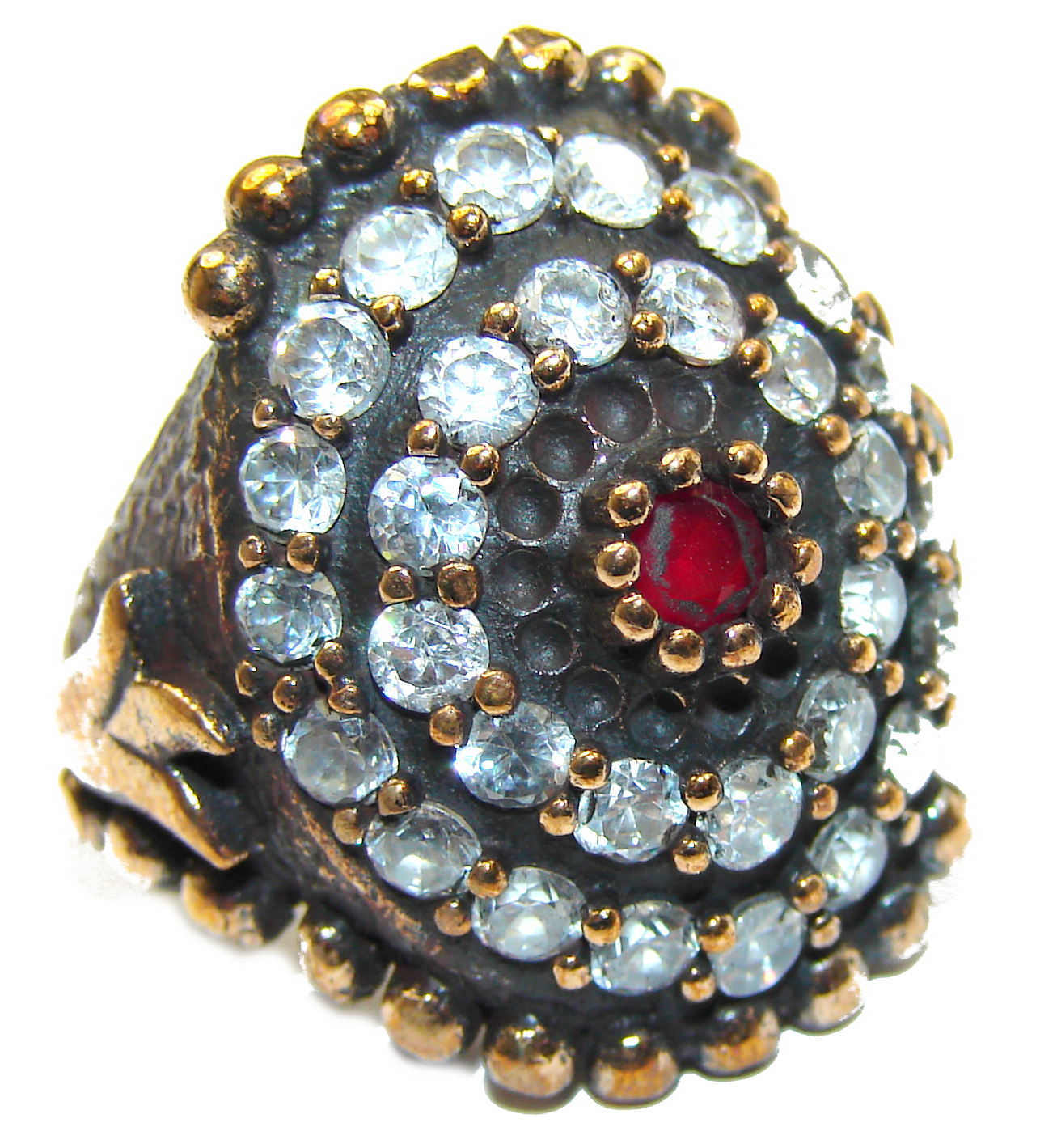 Large Victorian Style created Ruby & White Topaz Sterling Silver ring; s. 6 3/4