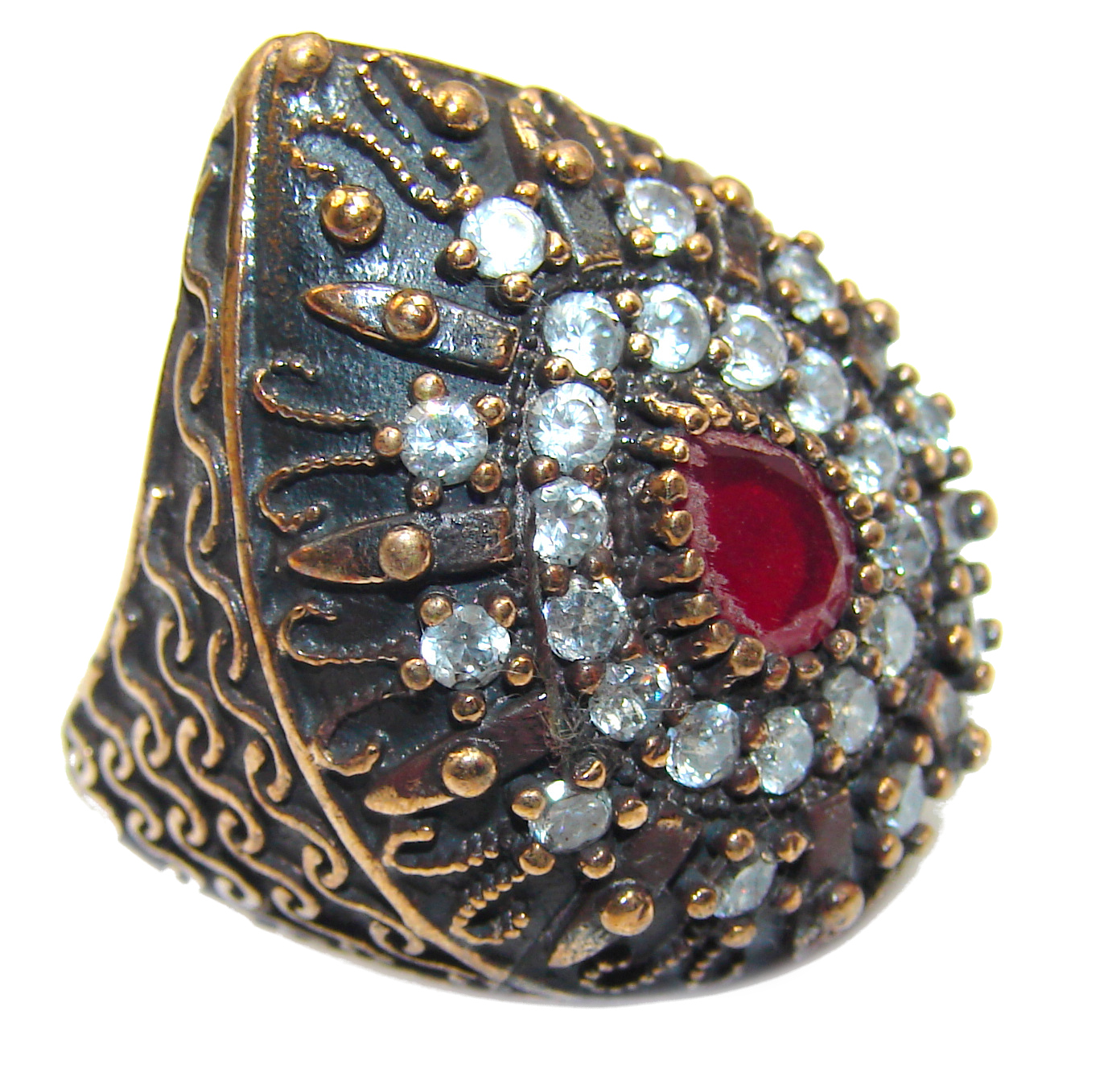Large Victorian Style created Ruby & White Topaz Sterling Silver ring; s. 6