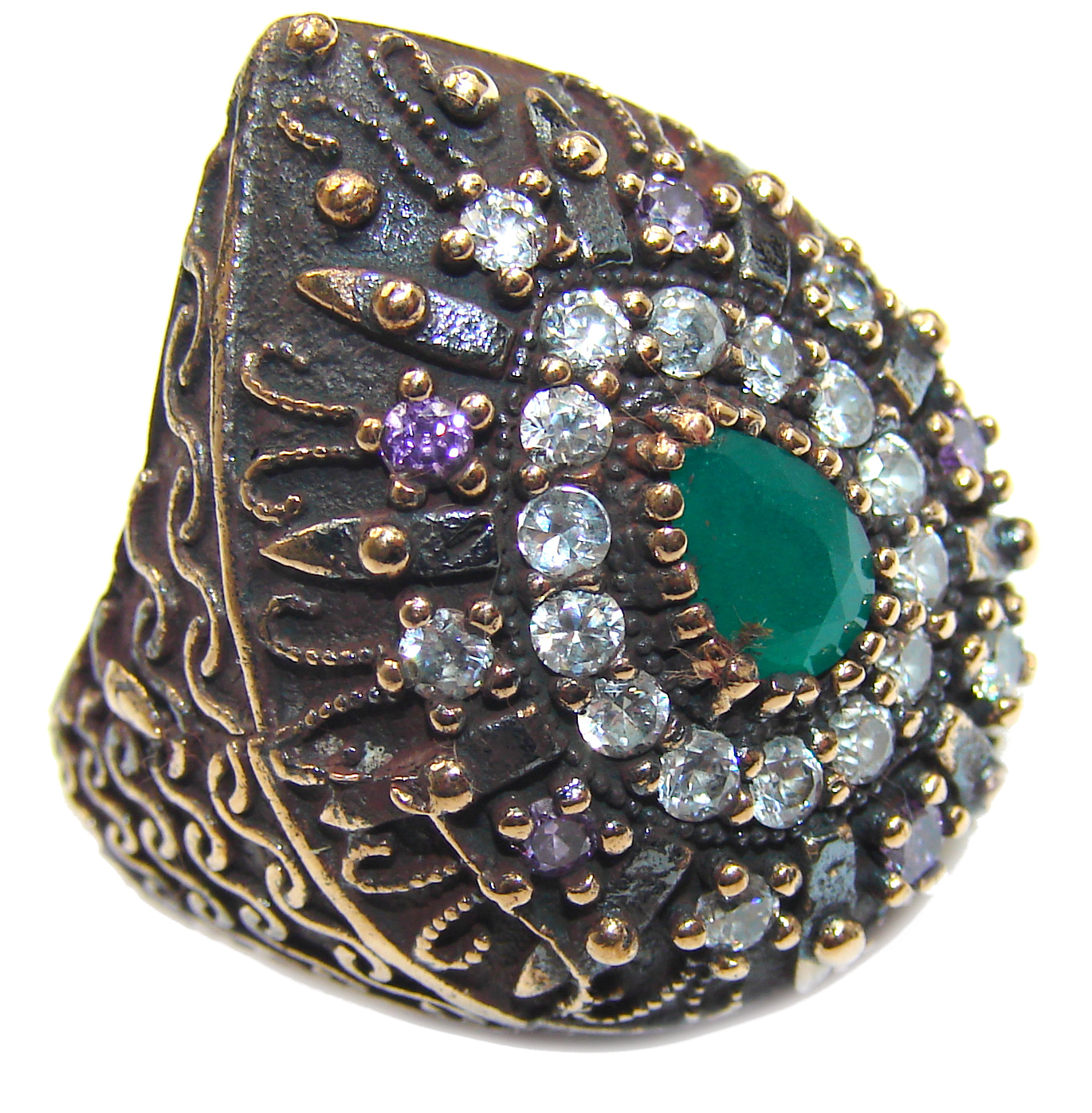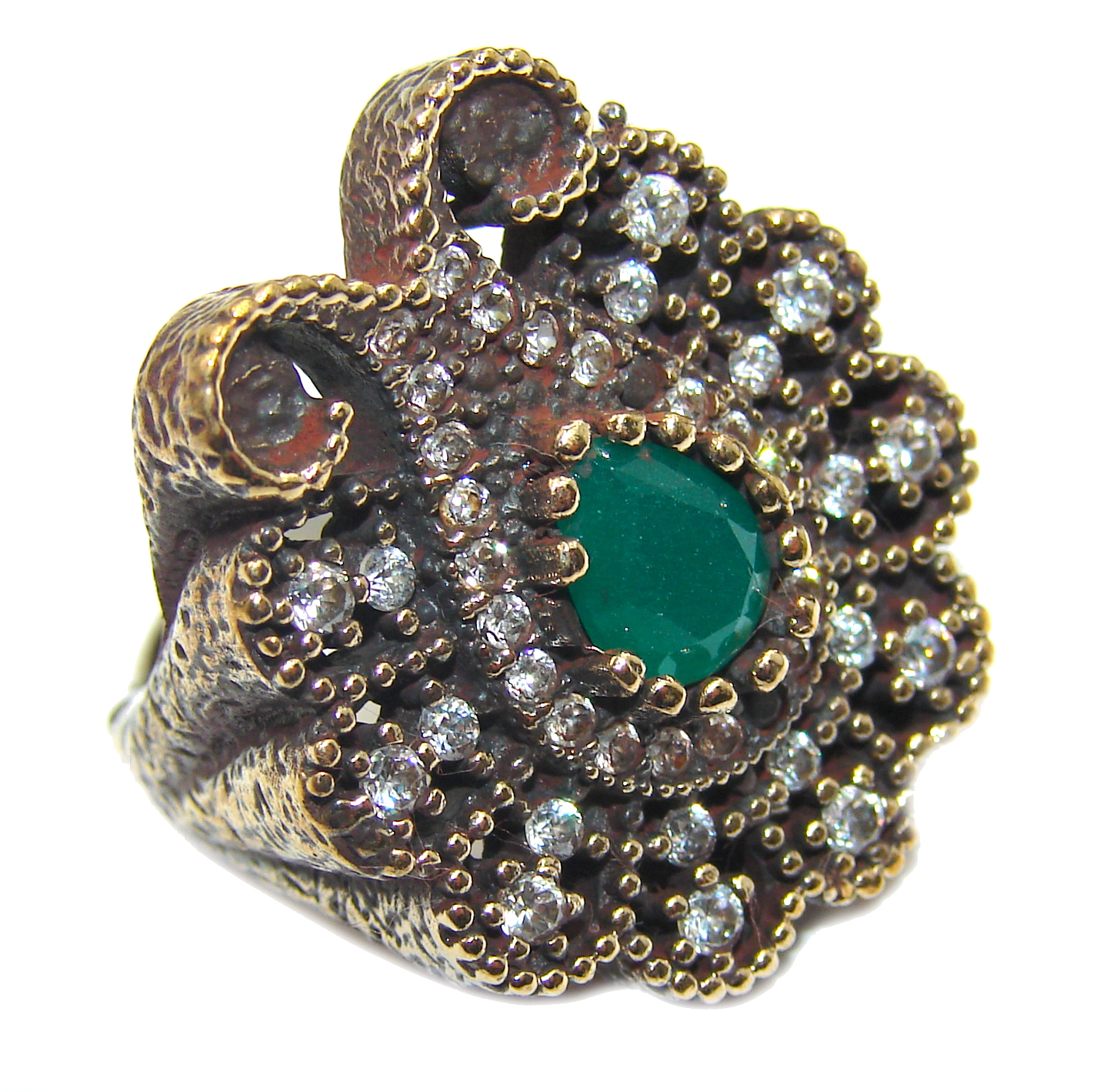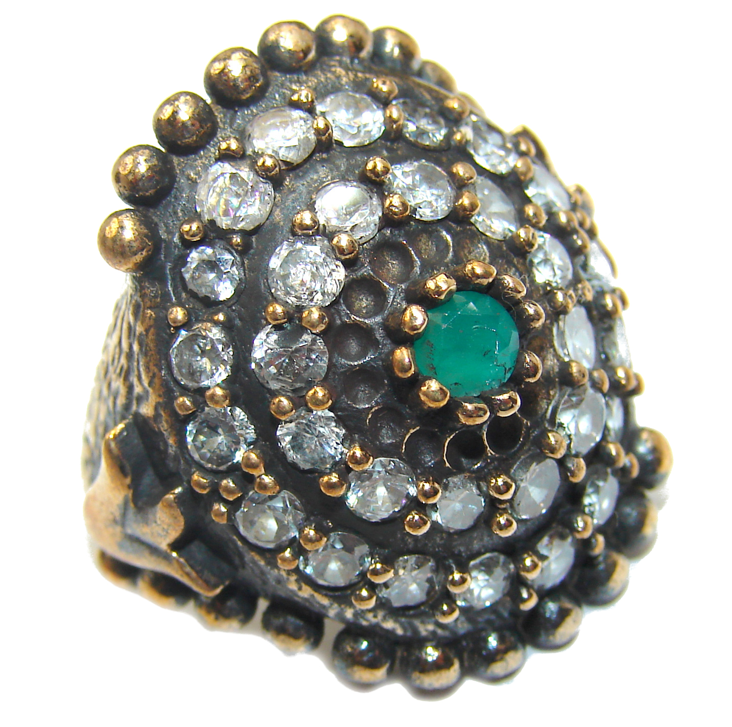Victorian Style created Emerald & White Topaz Copper over Sterling Silver ring; s. 5 1/4