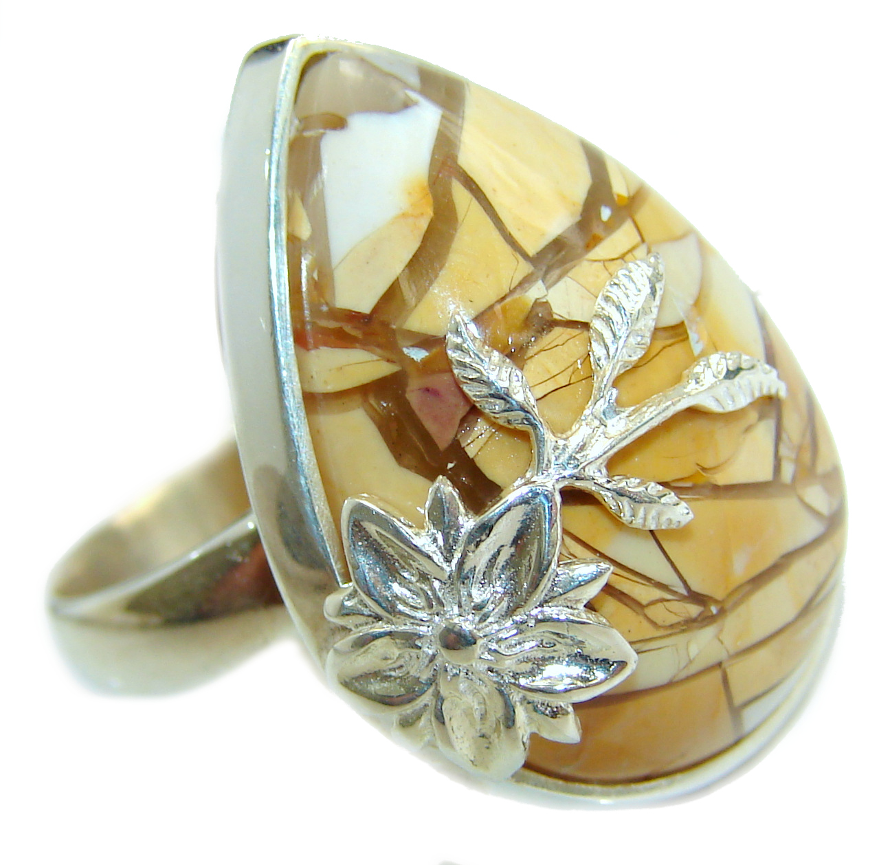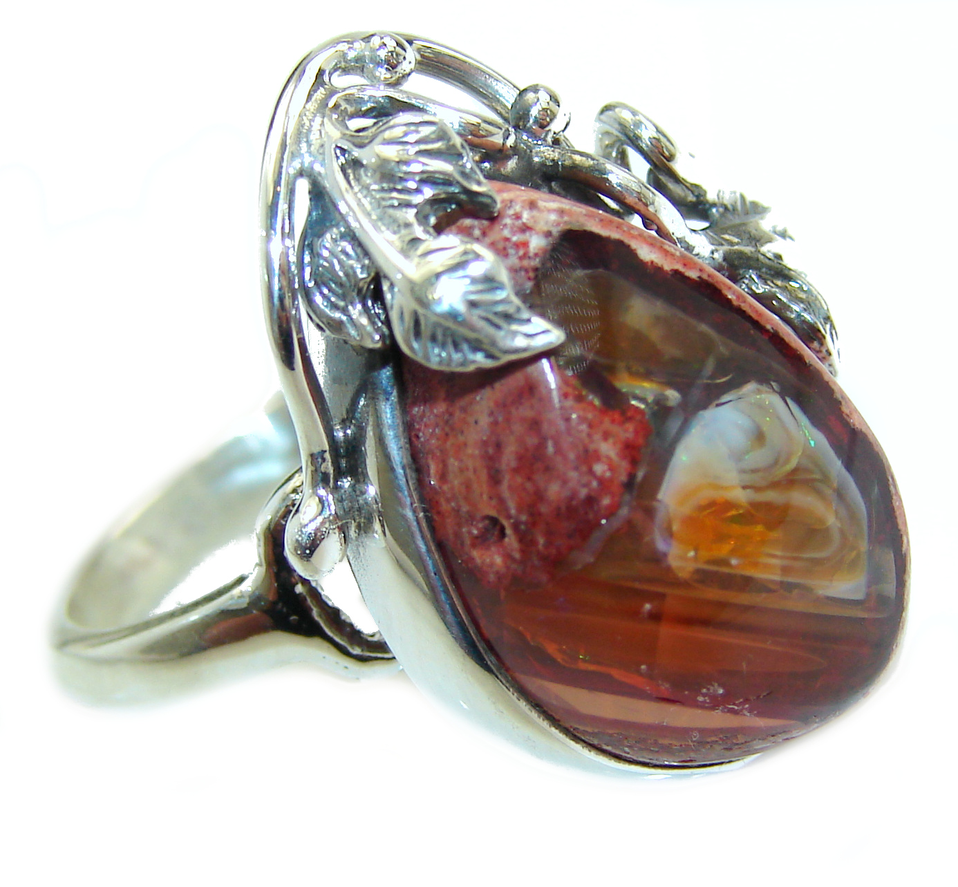 Floral Design Genuine Mexican Opal .925 Sterling Silver handmade Ring size 6 1/4