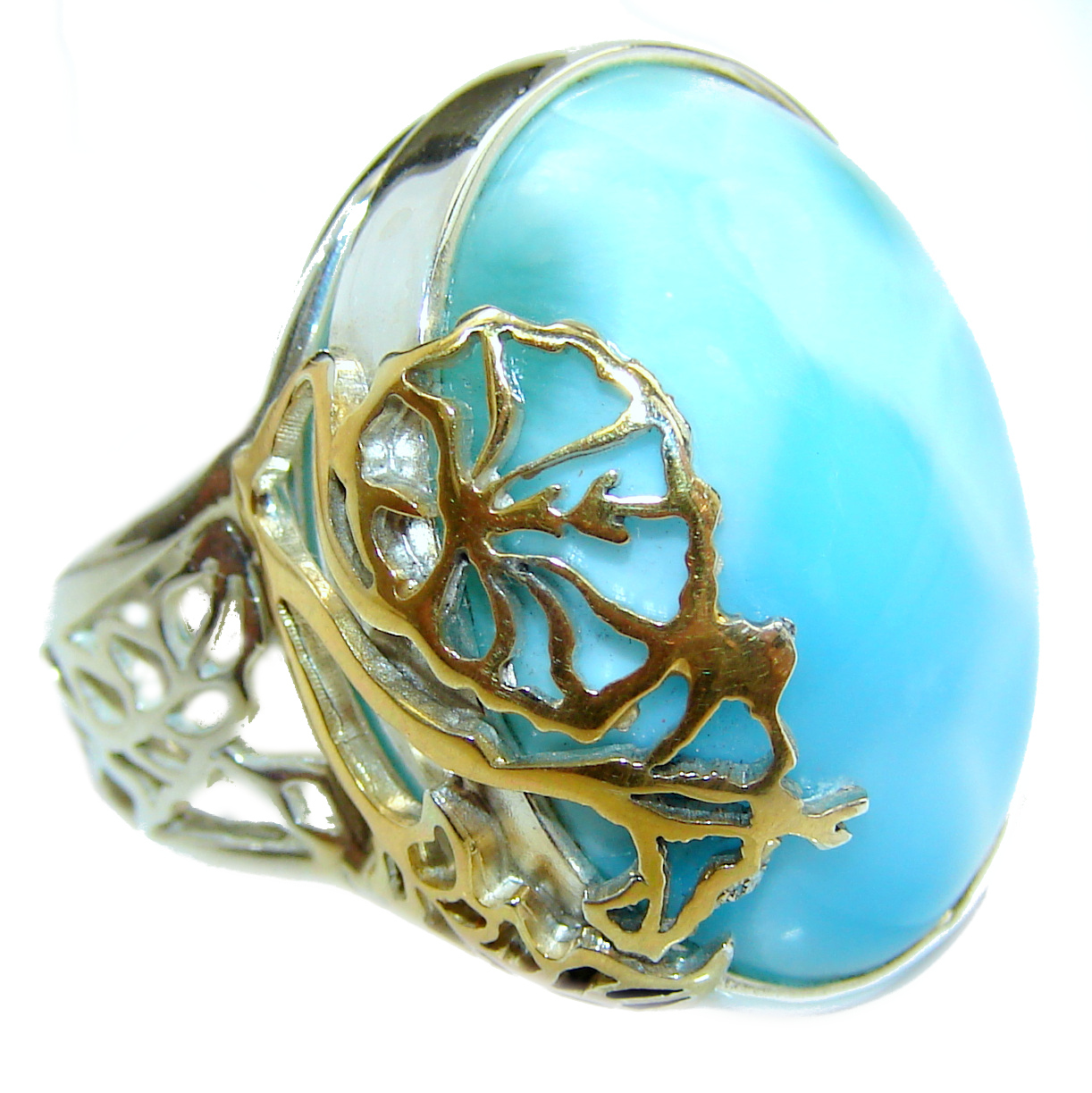 Vintage Design Natural Larimar two Tones .925 Sterling Silver handcrafted Ring s. 8 adjustable