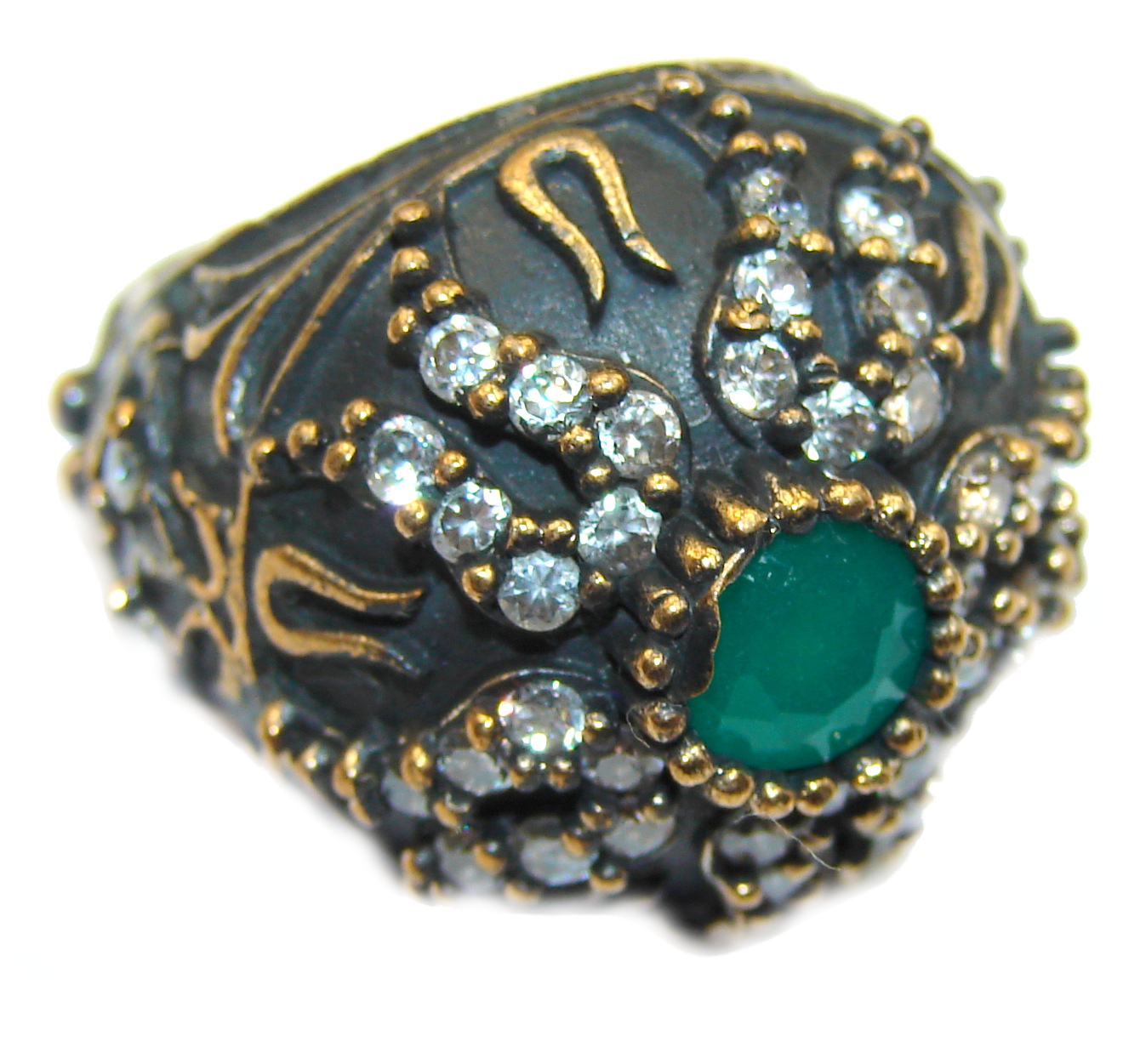 Victorian Style created Emerald & White Topaz Copper over Sterling Silver ring; s. 6 3/4