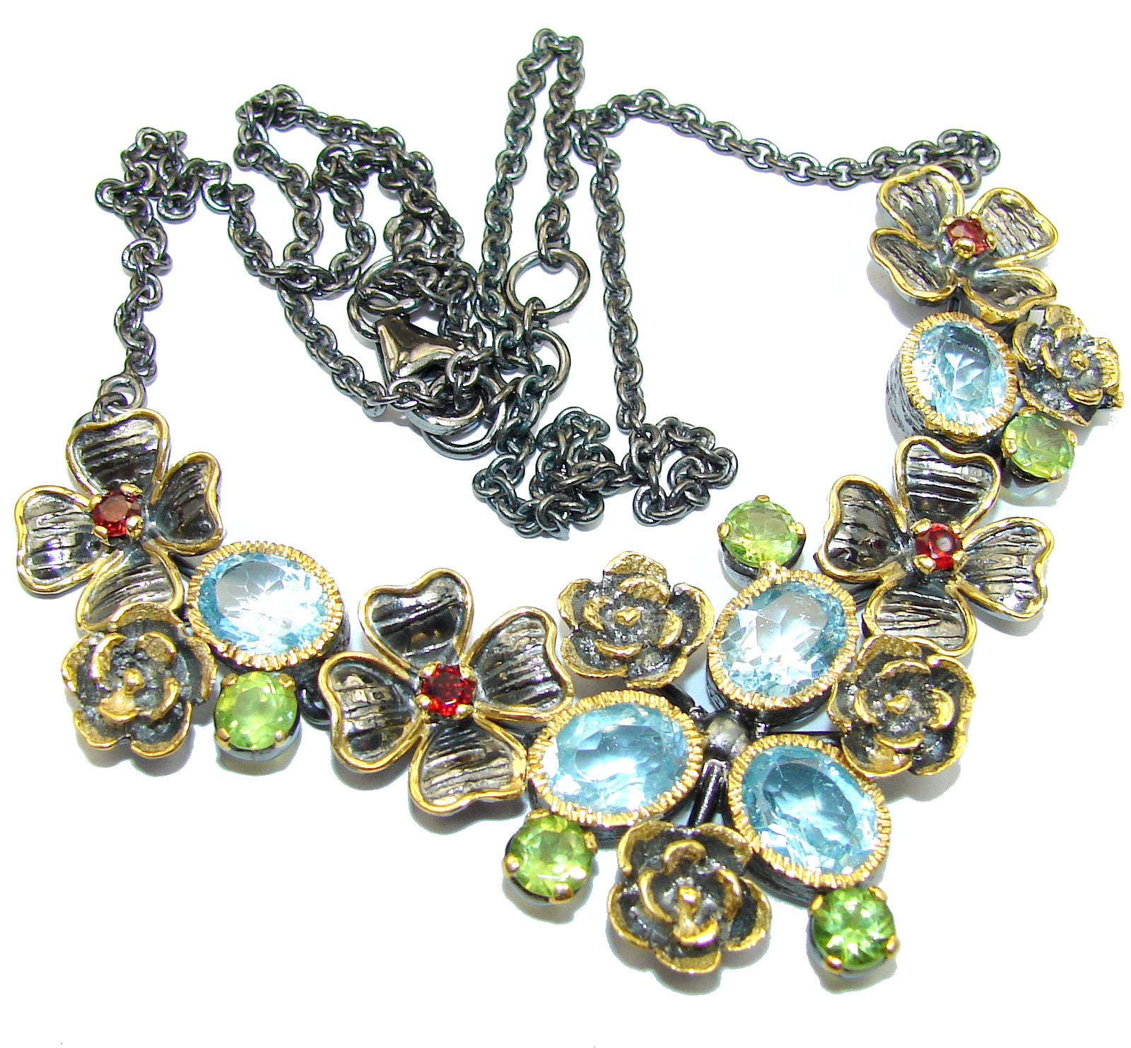 Floral Design Swiss Blue Topaz 14K Gold over .925 Sterling Silver handcrafted necklace