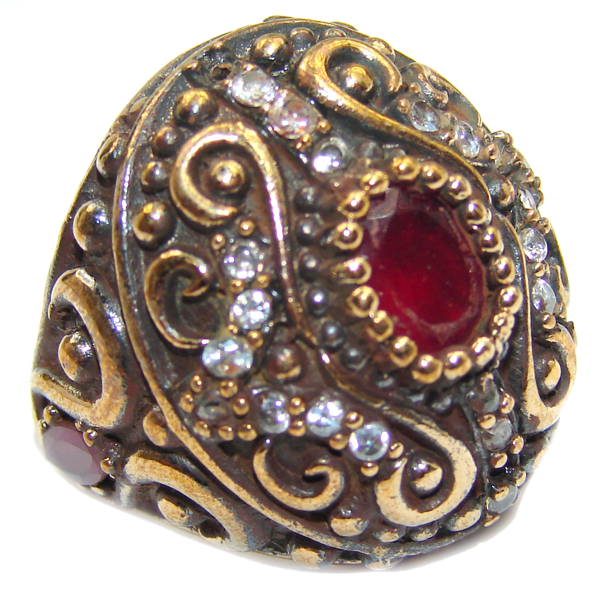 Large Victorian Style created Ruby & White Topaz Sterling Silver ring; s. 6